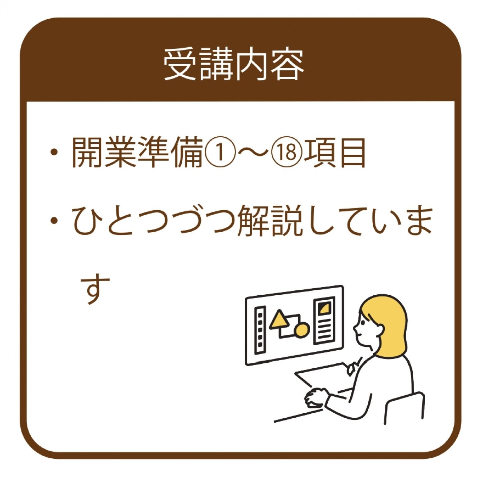 開業を思いたって『一体何から始めればいいんだろう?』という方へ店舗開業の手順など全12コースを通じてお伝えしています。