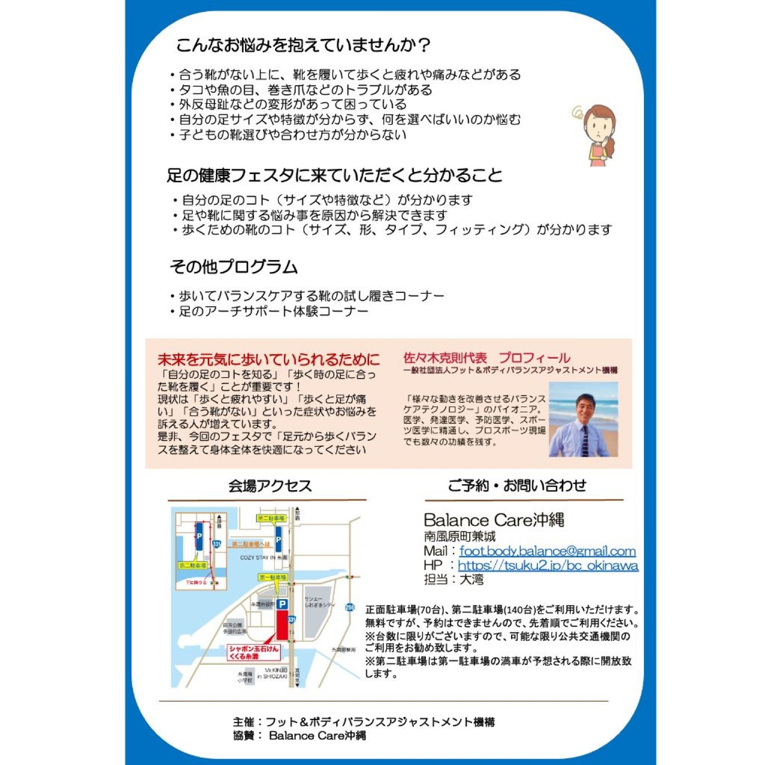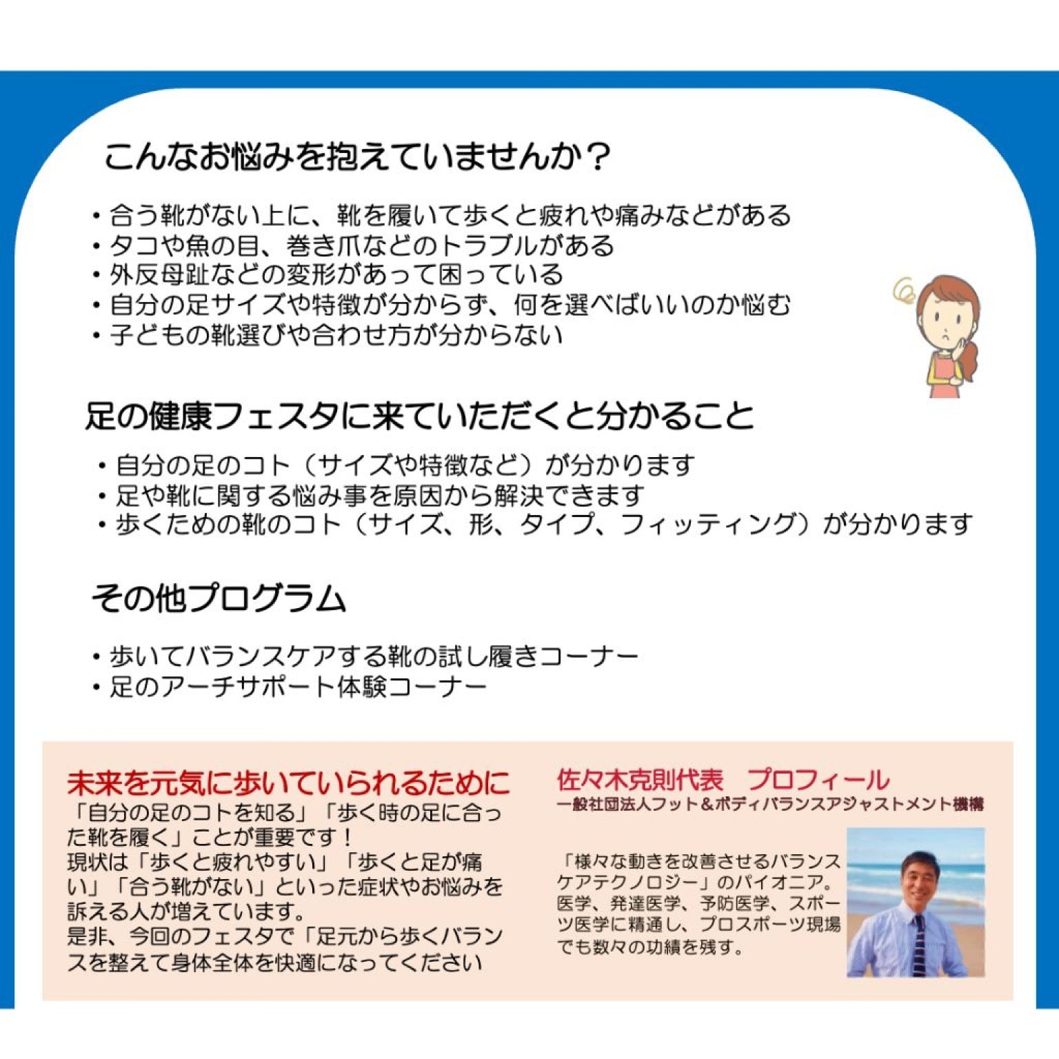 会場内にはアーチサポートや靴の体験コーナー、足関連の施術ブースも出す予定ですので、ぜひご覧ください。