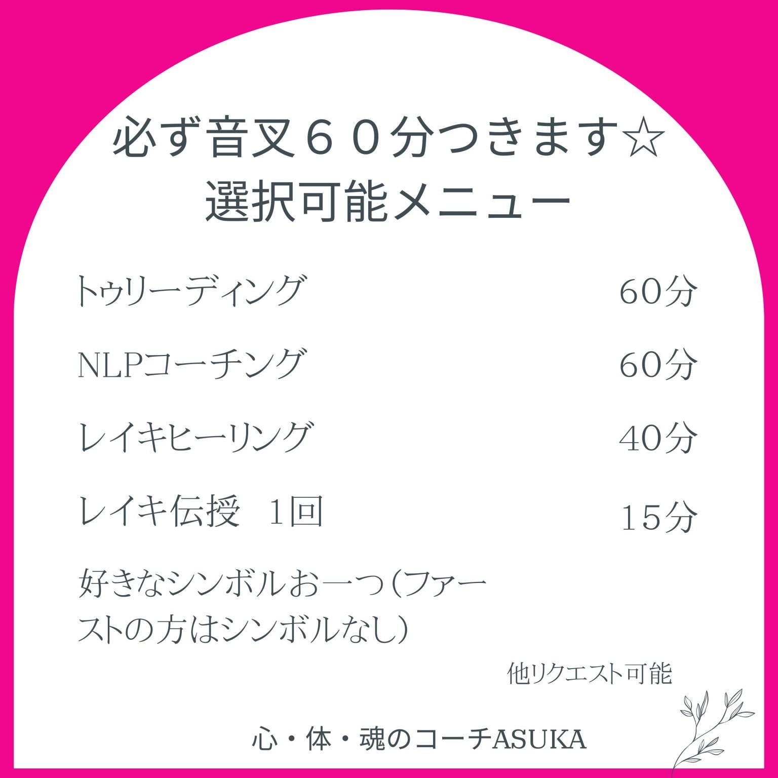 音叉60分+トゥリーディングorコーチングorレイキヒーリングorレイキ伝授(好きなシンボル1回)を選択できます。