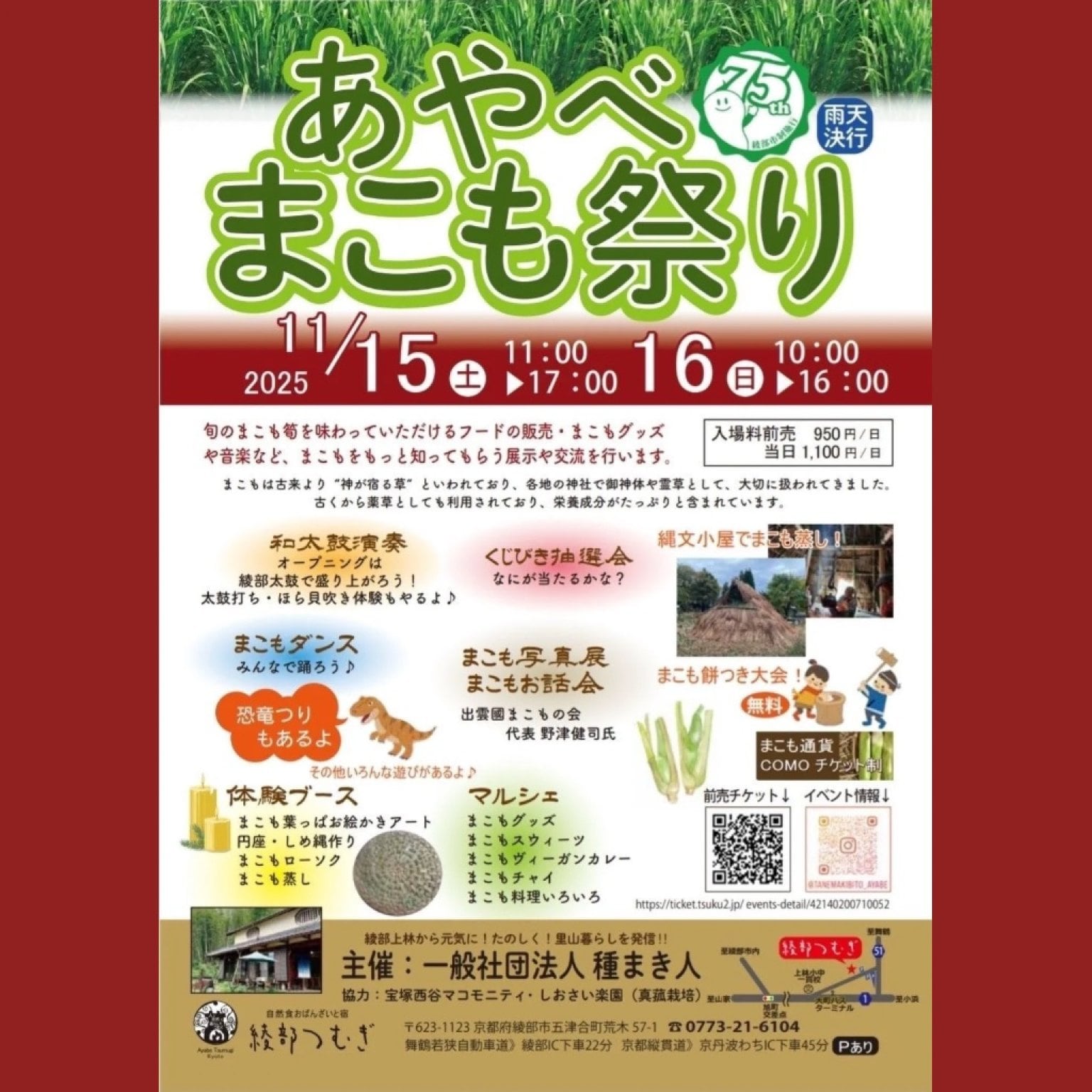 今の時期だけ、旬のマコモダケの美味しさを味わう、マコモの魅力を大満喫するイベント「あやべまこも祭り」が京都府綾部市の綾部つむぎの杜にて開催されます。