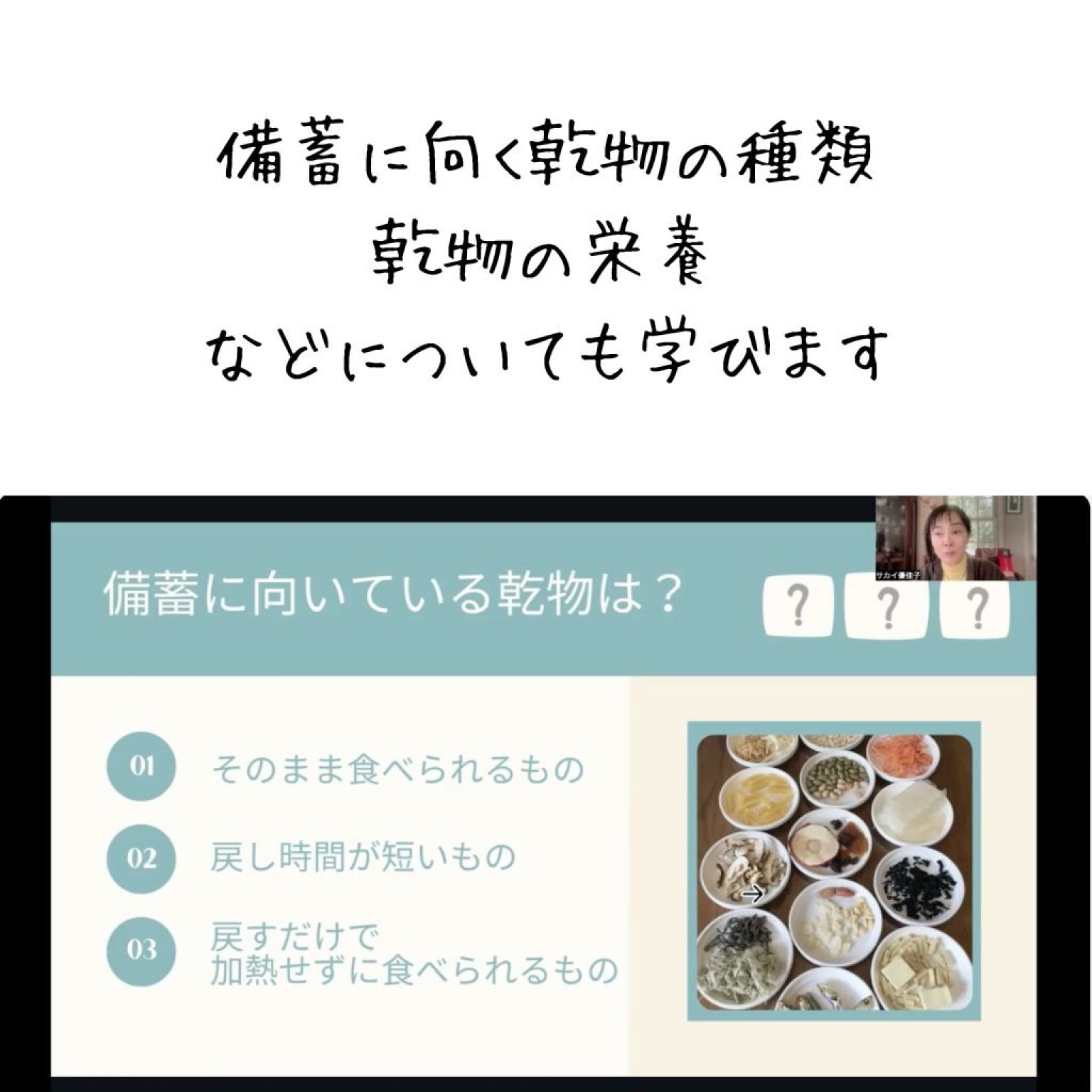 乾物の特徴、栄養バランスをワークをしながら楽しく学べました。乾物を水で戻さなくても簡単に出来るレシピもわかりやすく、いつもの食卓にも乾物を使ったレパートリーが増えるのが嬉しい。ローリングストックで無駄にもならず、何より乾物があれば『大丈夫』という気持ちの安心感をえられたことが私にはありがたかったです。