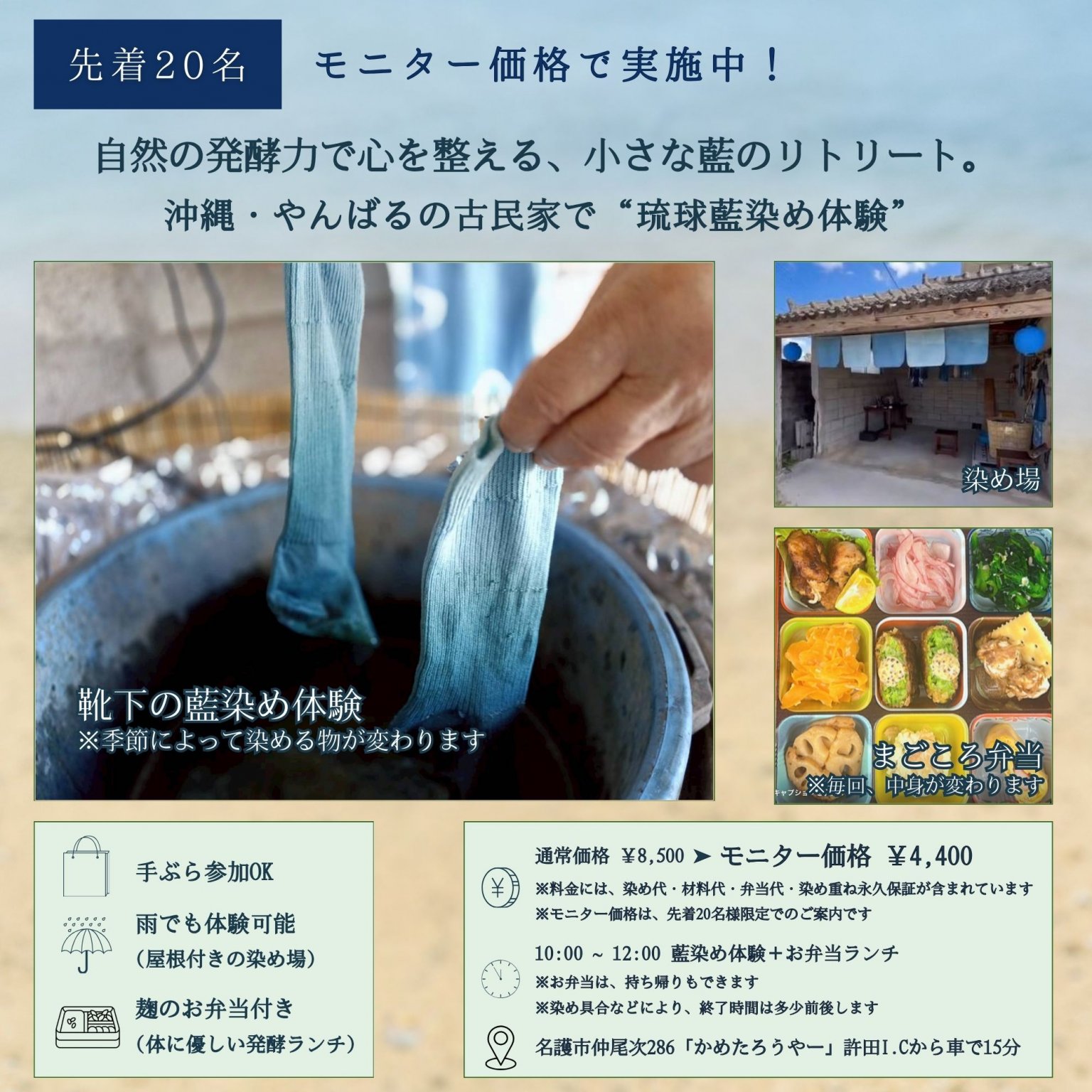 本プランでは、沖縄の伝統である「琉球藍」を使い、世界に一つだけのオリジナル“藍染め靴下”をつくります。