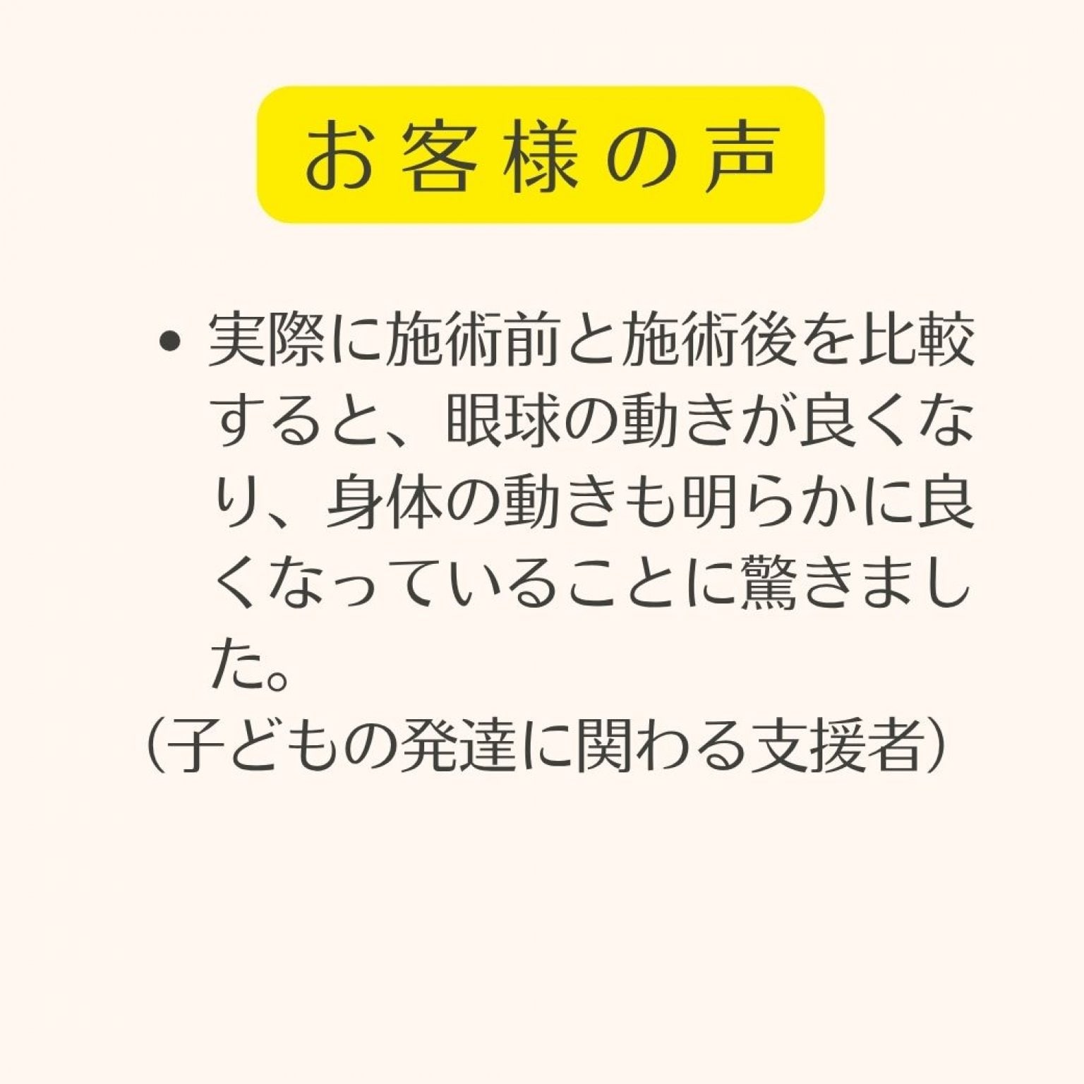 実際に施術前と施術後を比較すると、眼球の動きが良くなり、身体の動きも明らかに良くなっていることに驚きました。