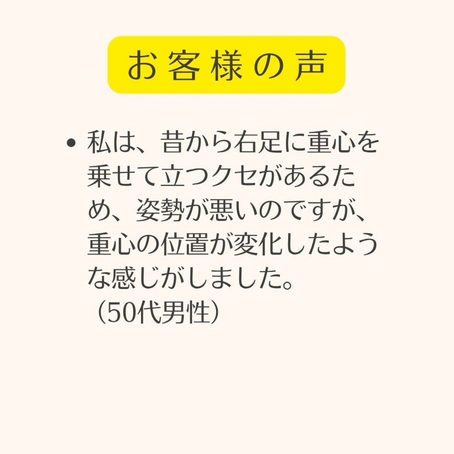 施術をして頂いて、すぐに体感があったのは、両足に体重が乗っているという感覚でした。
