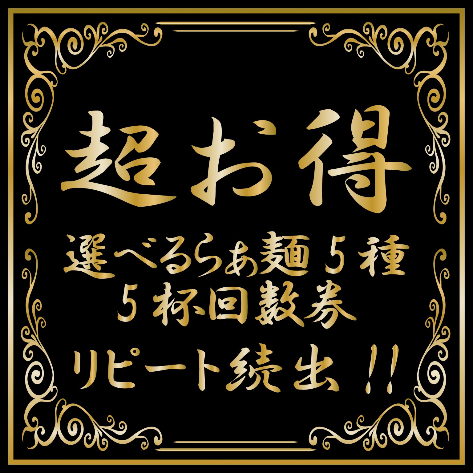 • 5種選べる!豚骨魚介らぁ麺・醤油らぁ麺・味噌らぁ麺・坦々麺・豚骨塩らぁ麺 5杯分回数券