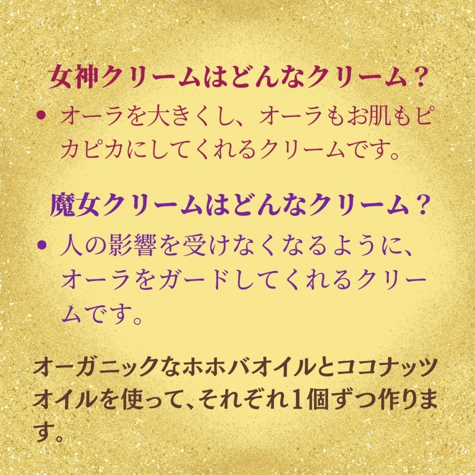 オーラをより大きく輝かせる女神クリームと、オーラガードになる魔女クリーム作りの講座を開催いたします。