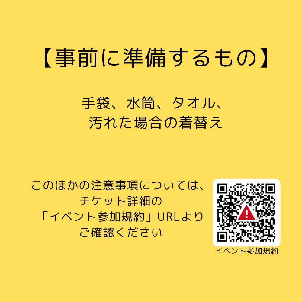 準備する道具:手袋、水筒、タオル、雨の場合は着替え。汚れてもいい服装でお越しください。