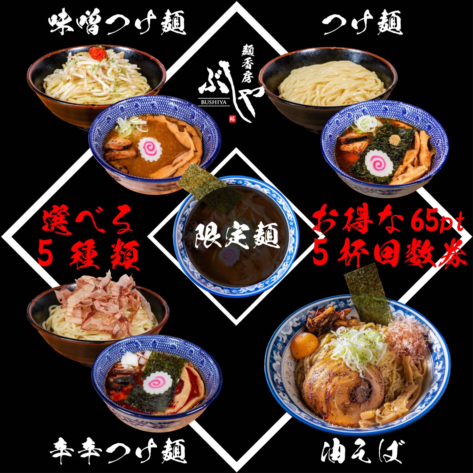 麺香房ぶしや本店、ながおか花火館店、堺東店にて、こちらのウェブチケットをご利用しお支払いすると、ウェブチケット分のポイントがお客様に付与されます。