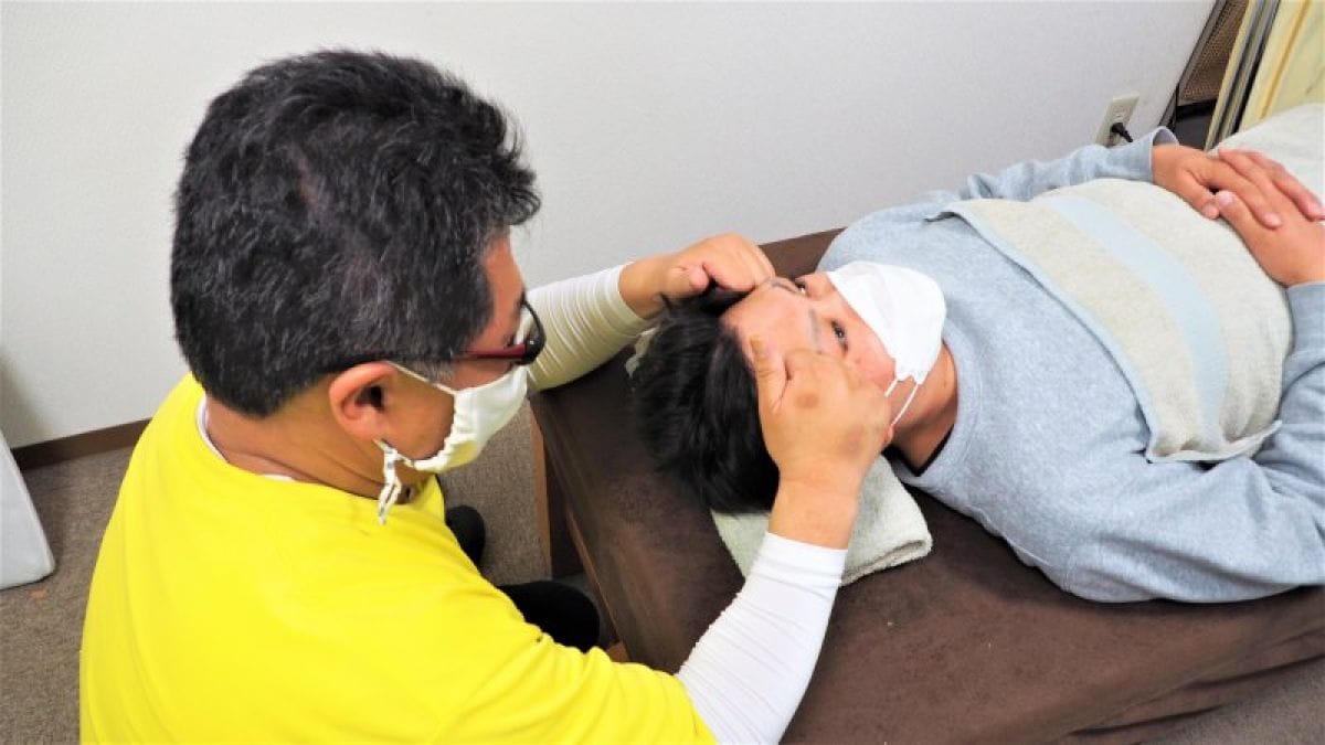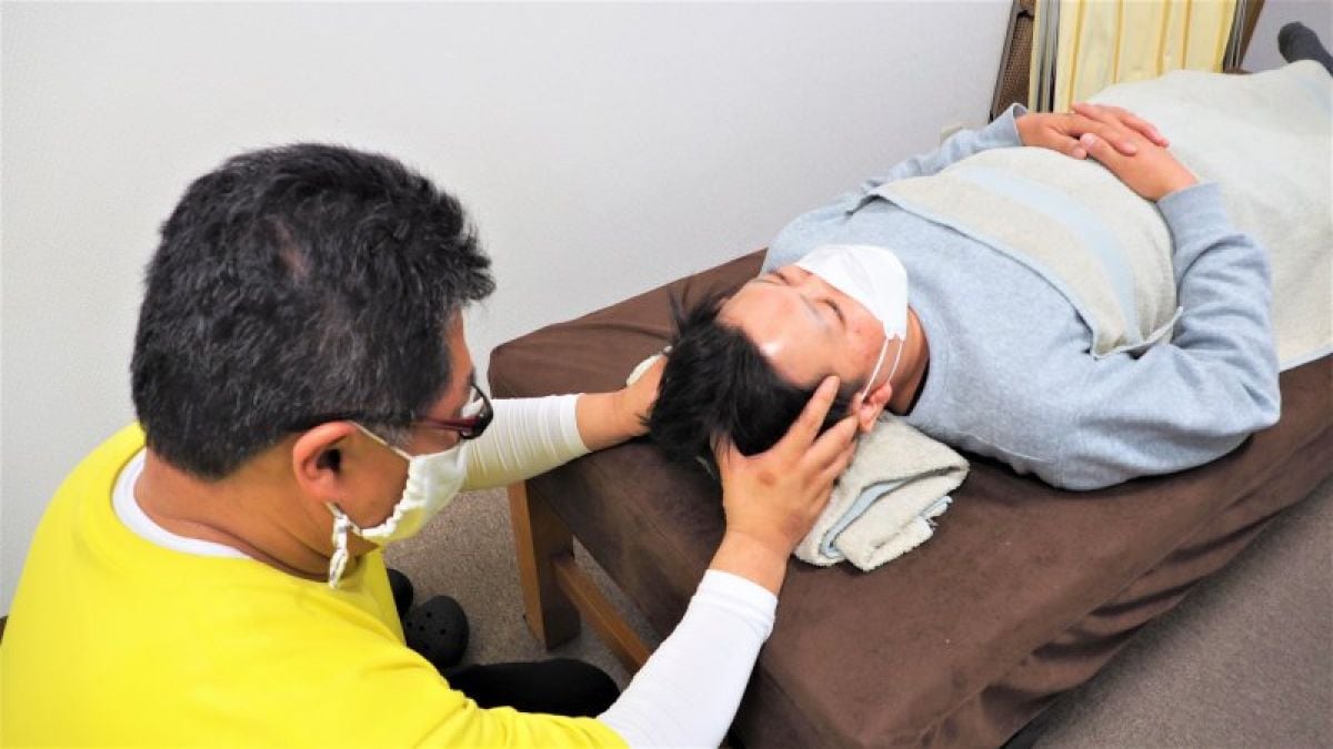 当院では全身の調整を行う手技を行い終盤に微弱電流ヘッドバンドを行います。