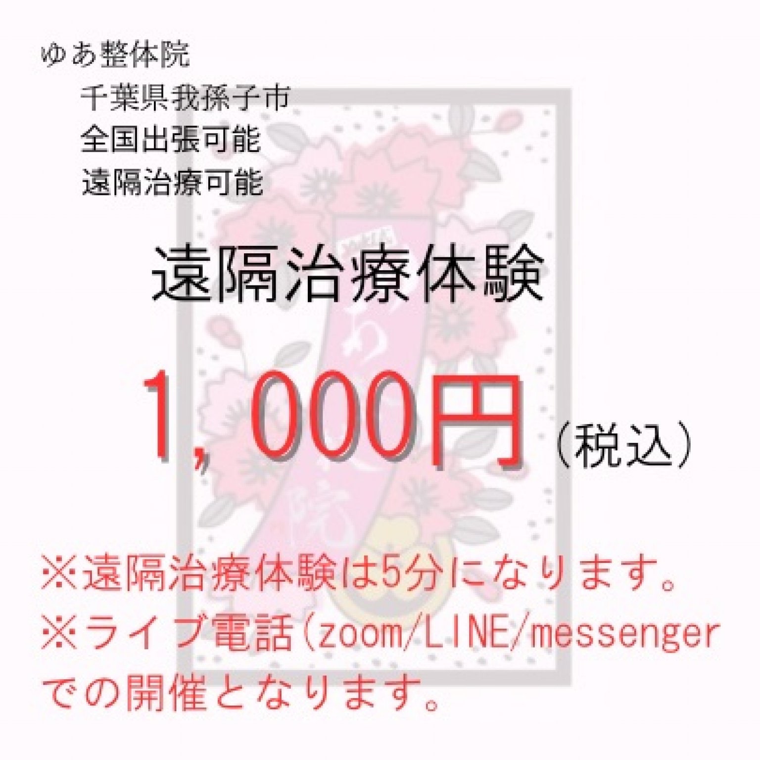 ※必ず「お名前」「施術希望日/時間帯」とご希望のライブチャット方法「zoom/LINE/Messengerのいずれか」をお知らせください。