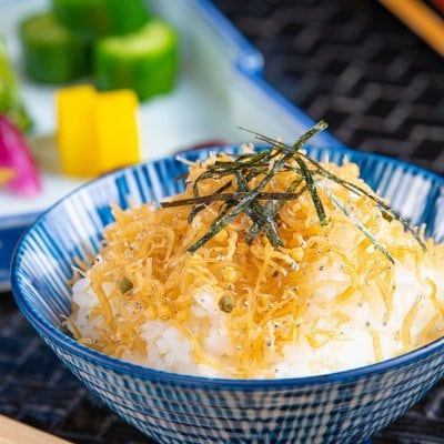 おじゃこを残したまま京都宇治から取り寄せている香ばしいほうじ茶をかけ、お茶漬にしてお召し上がりください。