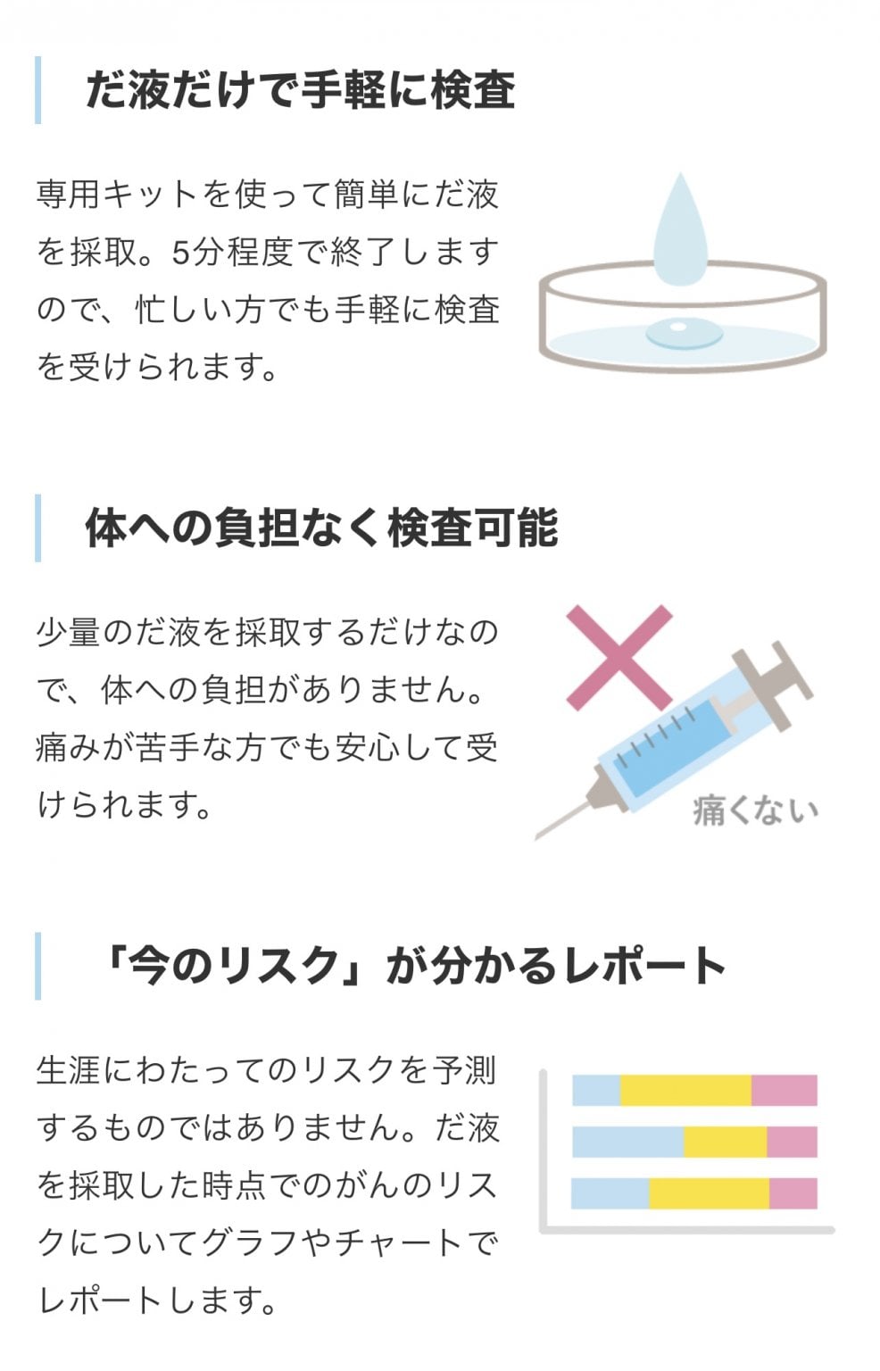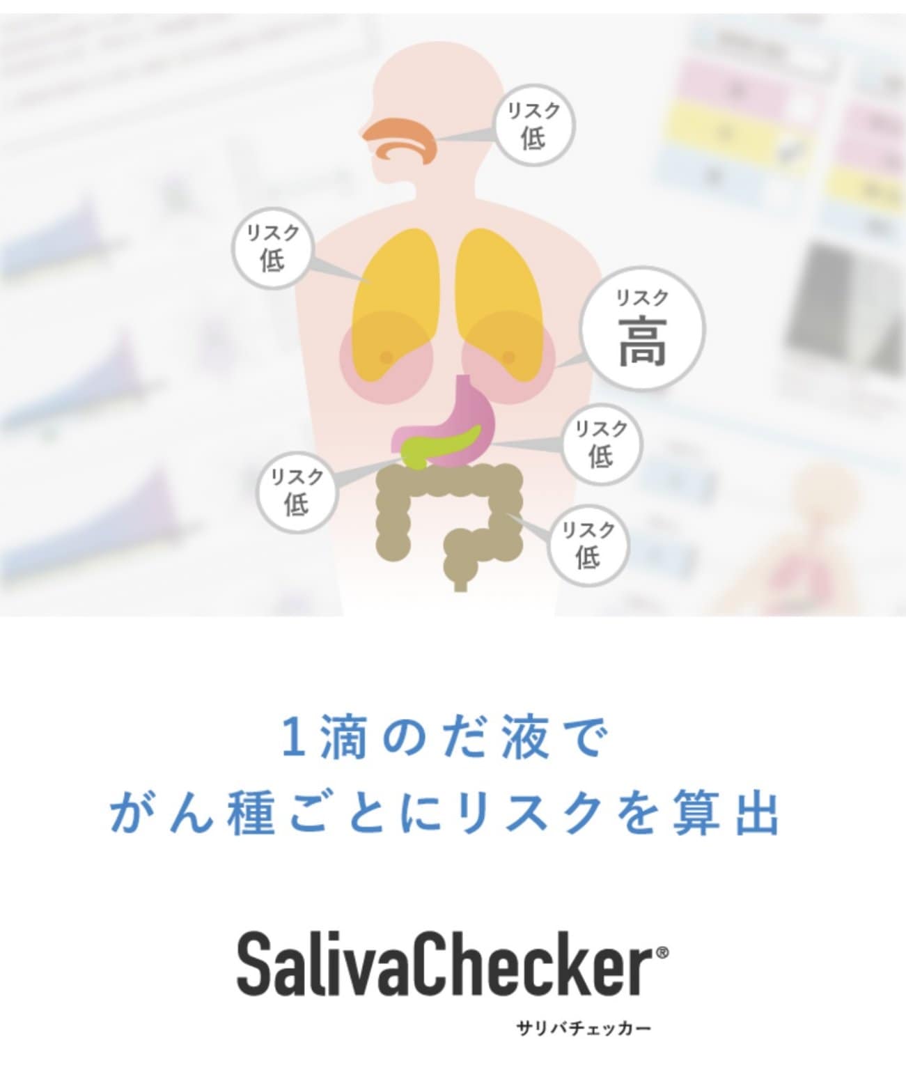 生涯にわたってのリスクを予測するものではありません。だ液を採取した時点でのがんのリスクについてグラフやチャートでレポートします。