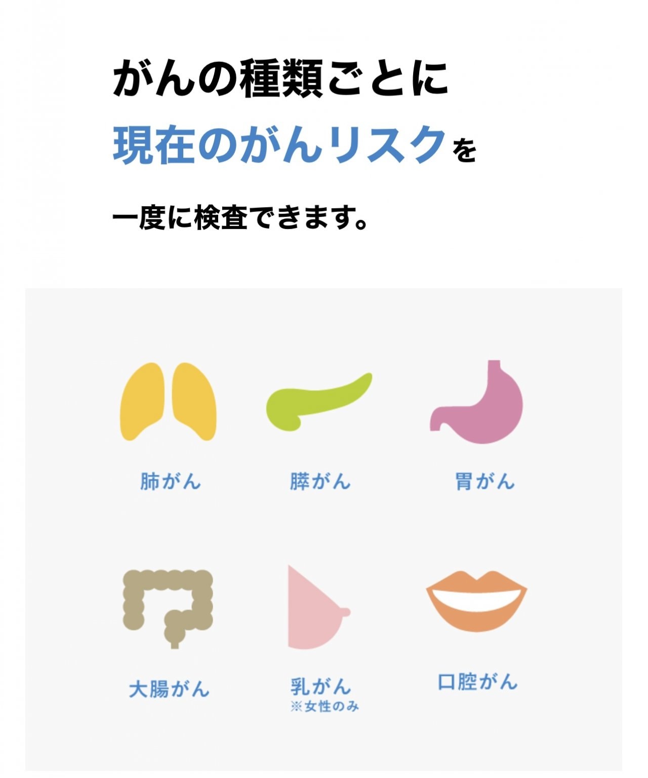 サリバチェッカーはだ液を採取するだけの手軽な検査です。1度の検査で6つのがん種ごとに現在のがんリスクを調べることができます。