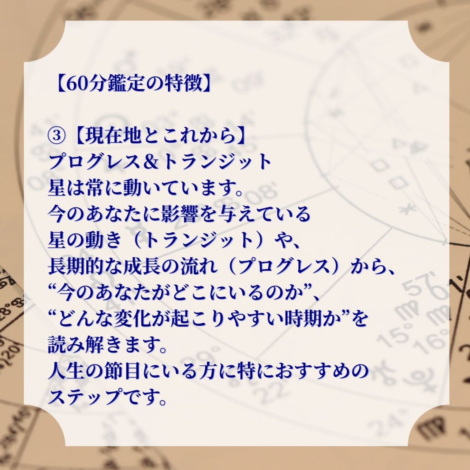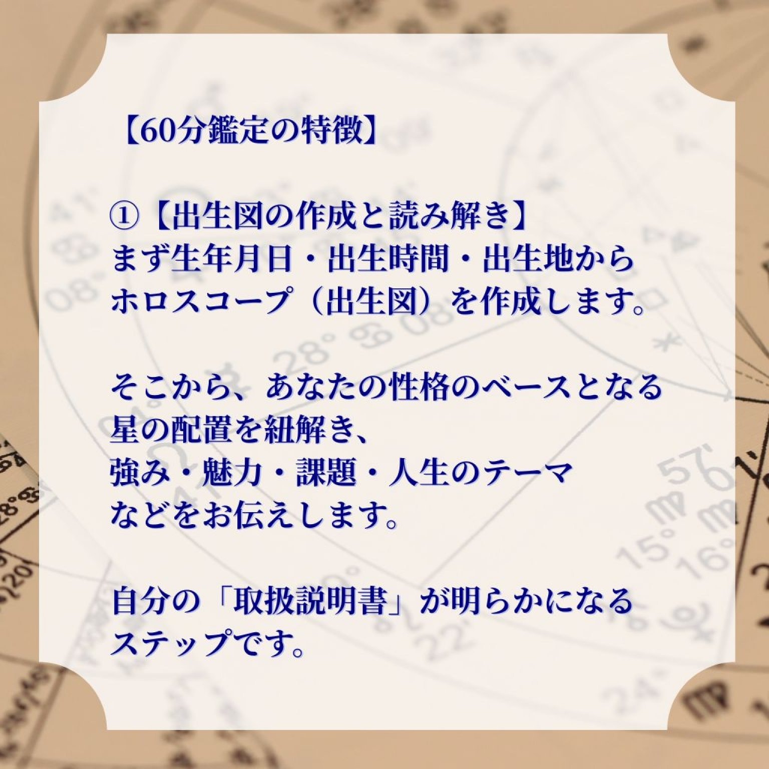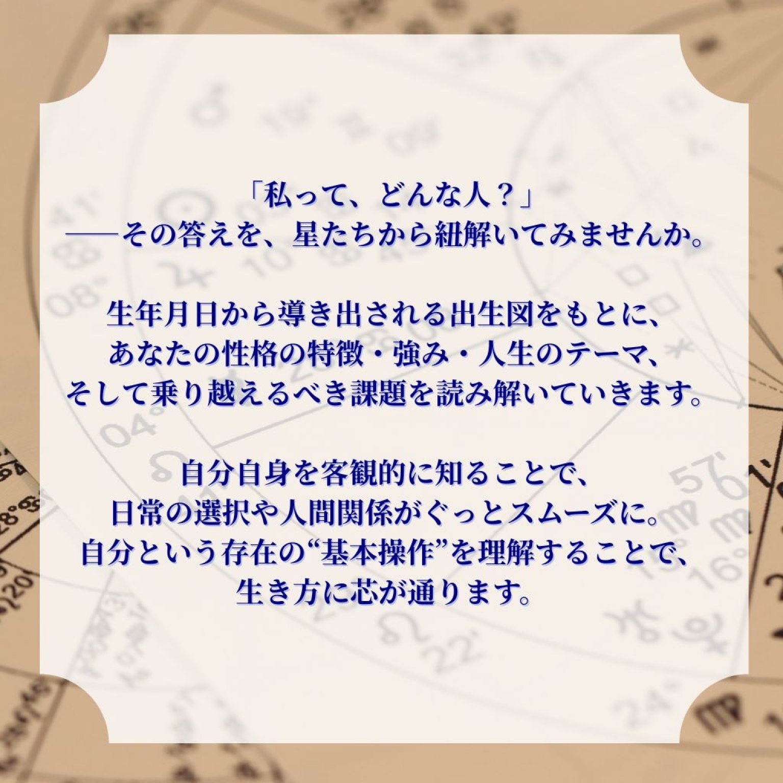 この鑑定では、生年月日から導き出される出生図をもとに、あなたの性格の特徴、強み、人生のテーマ、そして乗り越えるべき課題を読み解いていきます。自分自身を客観的に知ることで、日常の選択や人間関係がぐっとスムーズになります。自分という存在の“基本操作”を理解することで、生き方に芯が通ります。