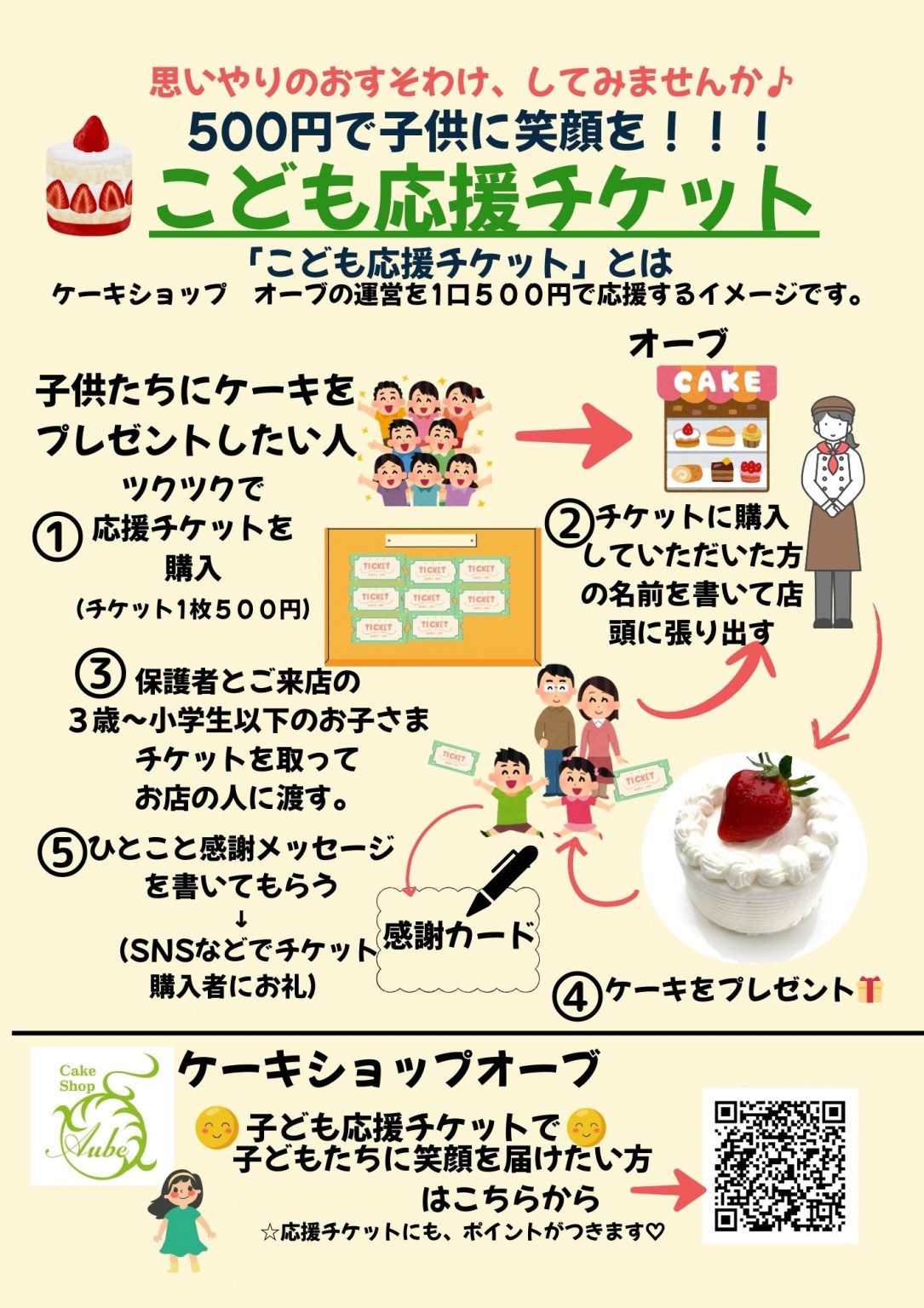 ご購入いただきましたチケットは、当店でお買い上げいただいたお客様で、子ども応援の日に保護者の方と一緒にご来店していただいた3歳から小学生までのお子様への、オリジナルショートケーキの提供に充てられます。(ショートケーキの大きさは、高さ7cm、直径8.5cm、フルーツは季節のものを使っていきます。オーブのケーキだけは、食べられると、大変人気のショートケーキです。)