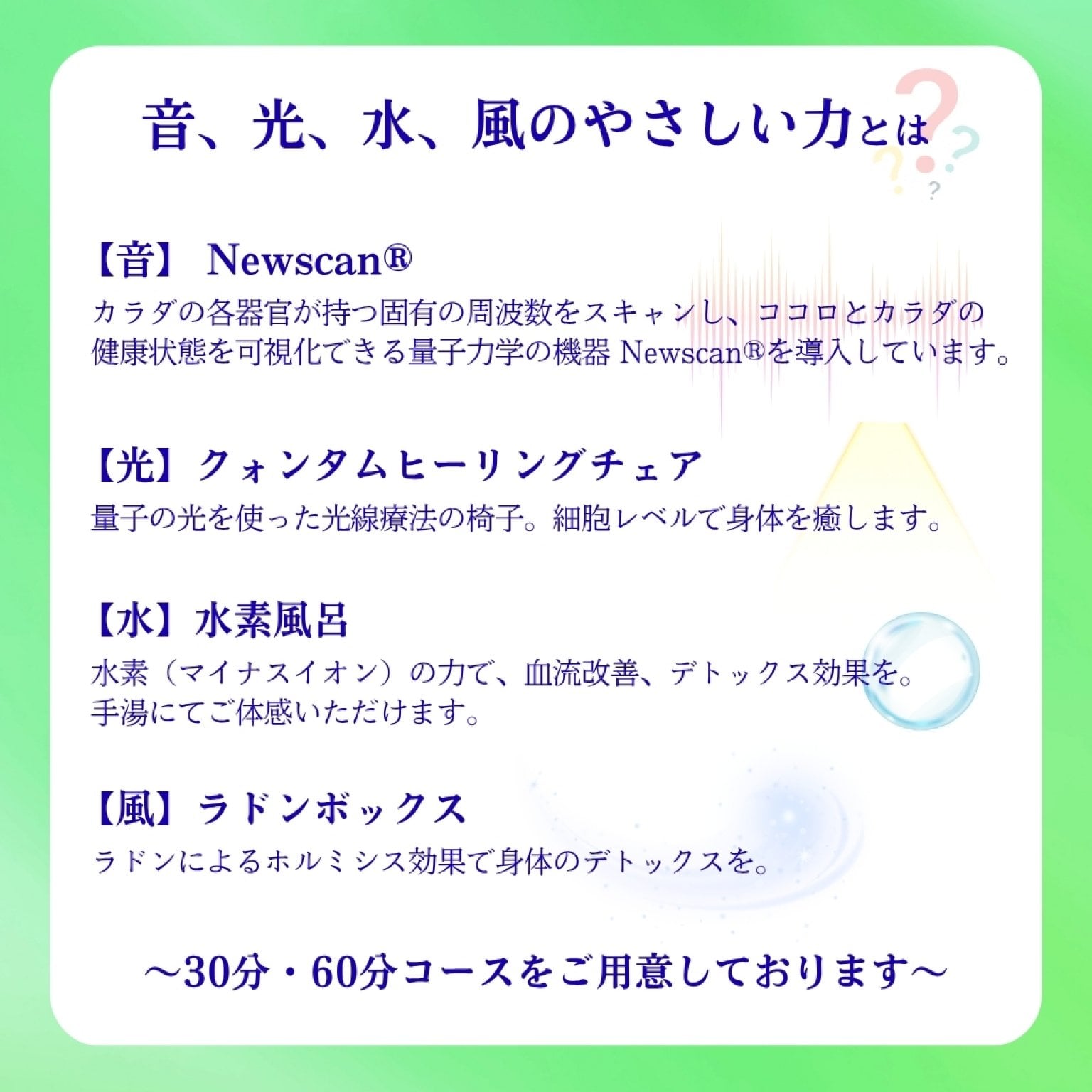・天然ラドンの微量放射線効果により、免疫力・自律神経の調整が期待される空間内で癒しの時間をお過ごしください。