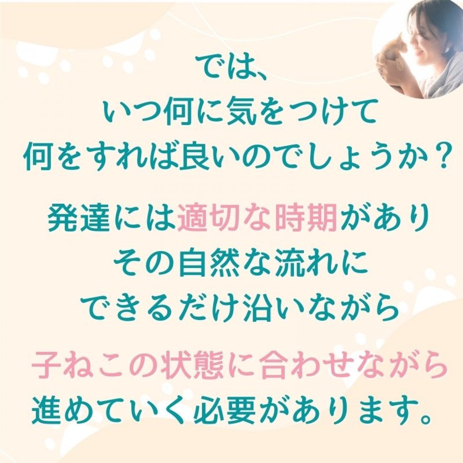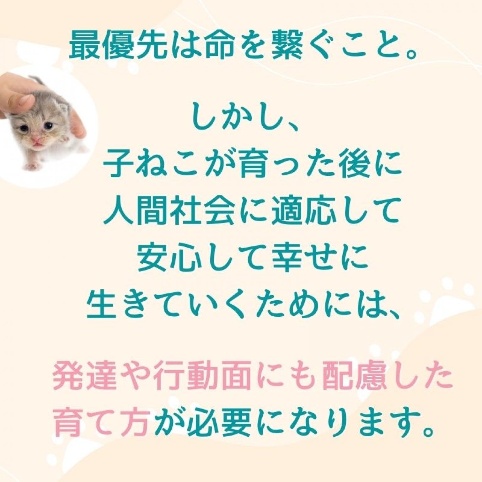 ですから、この時期に拾った子猫を育てる時は将来人間社会に適応し、安心して暮らせるようにするために発達や行動面にも配慮した育て方がとても大切なのです。