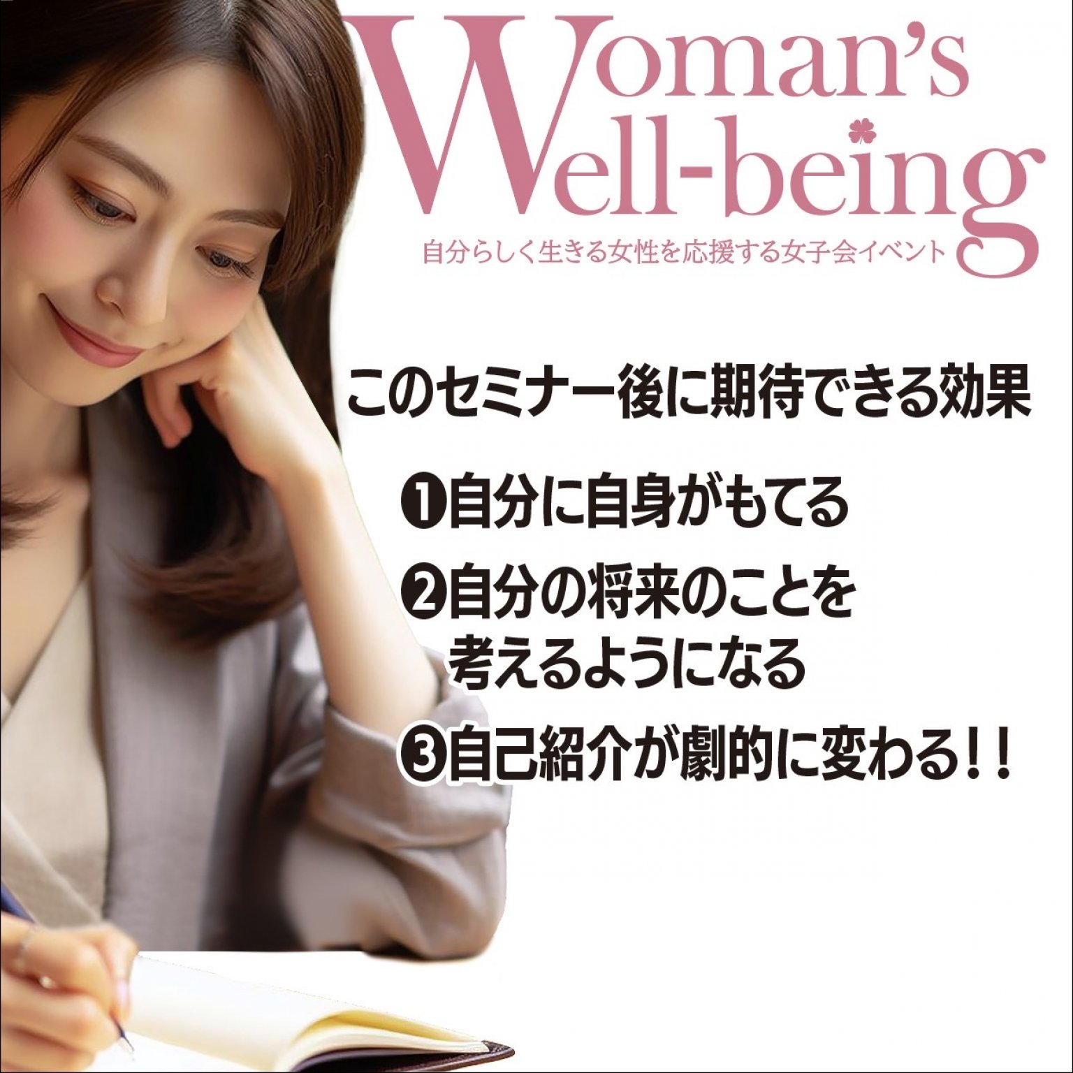 弊社の運営するWoman's well-beingシリーズの女子会イベントは、自分らしく生きる女性を応援することを目的としたイベントです。世の中の全ての女性たちのウェルビーイングを願い、身体的、精神的、社会的、全ての側面からアプローチできるイベントを企画していくことで、ここに来るだけで自然とウェルビーイングになれるような環境作りを目指しています。