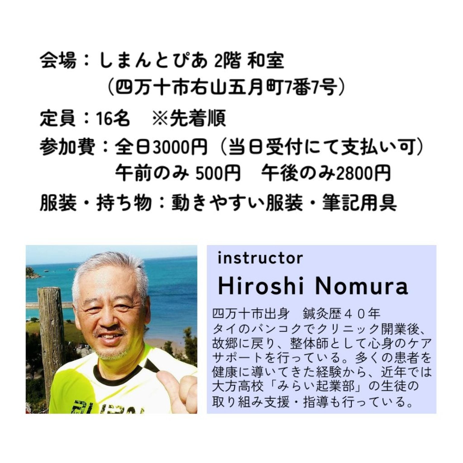 タイのバンコクでクリニック開業後、故郷に戻り、整体師として心身のケアサポートを行っている。多くの患者を健康に導いてきた経験から、近年では大方高校「みらい起業部」の生徒の取り組み支援・指導も行っている。