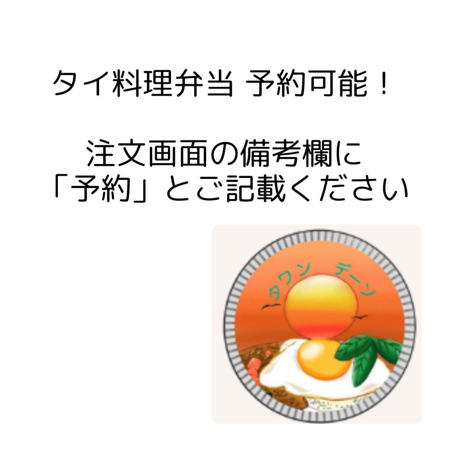 タイ料理「タワンデーン」のタイ料理弁当を予約可能です。800円。予約の場合は必ず注文画面の備考欄に「予約」とご記入ください。