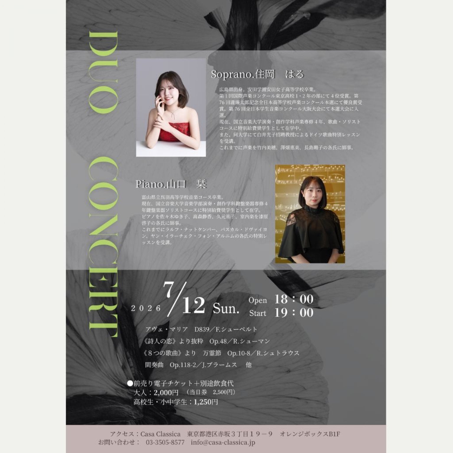 演奏予定曲目:アヴェ・マリア D839 /F.シューベルト 《詩人の恋》より抜粋Op.48/R.シューマン 《8つの歌曲》より 万霊節 Op.10-8/R.シュトラウス 間奏曲 Op.118-2 /J.ブラームス