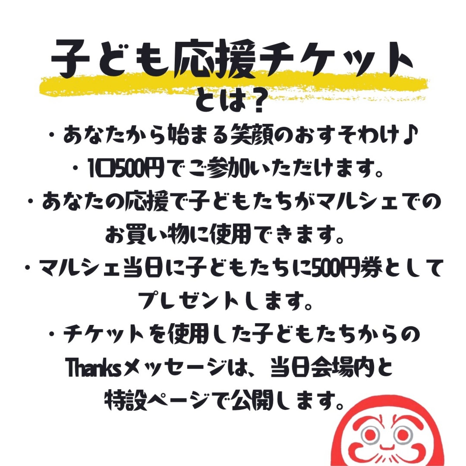 皆様にご購入いただいた応援チケットは、まるマルシェ当日に中学生以下のこどもに500円券としてプレゼントします。