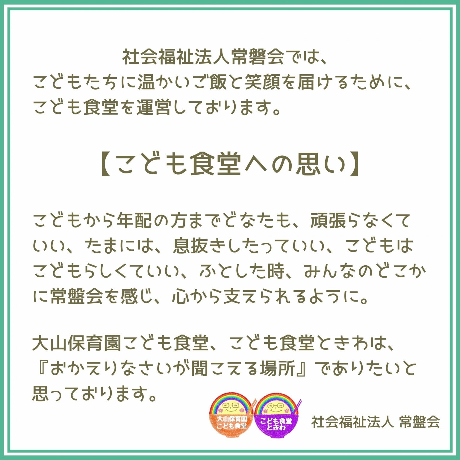 大山保育園こども食堂、こども食堂ときわは、“おかえりなさいが聞こえる場所”でありたいと思っております。