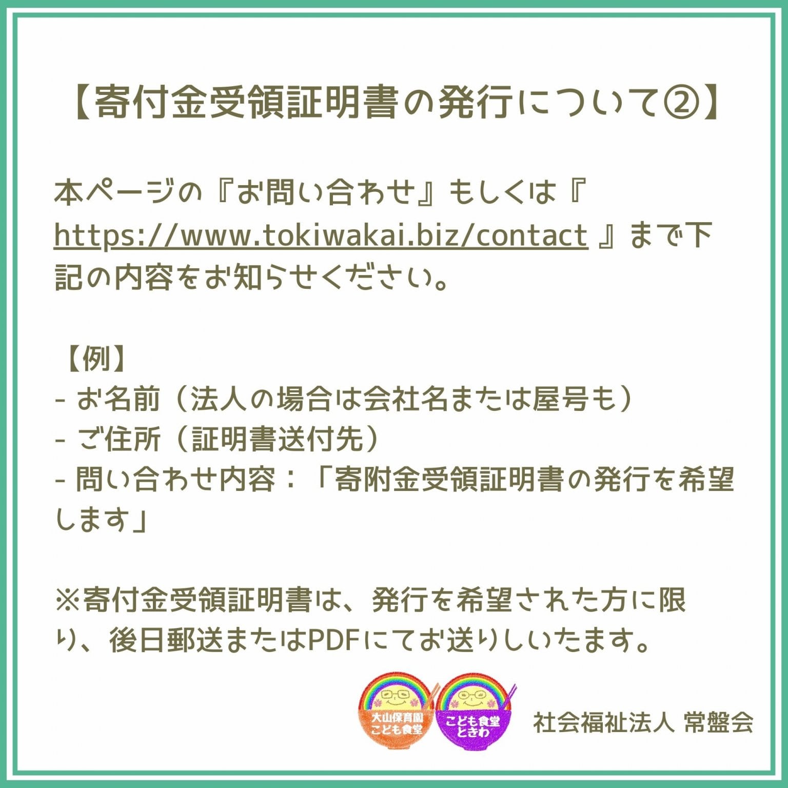 発行を希望される場合は、本ページの『お問い合わせ』もしくは『 https://www.tokiwakai.biz/contact/ 』まで下記の内容をお知らせください。