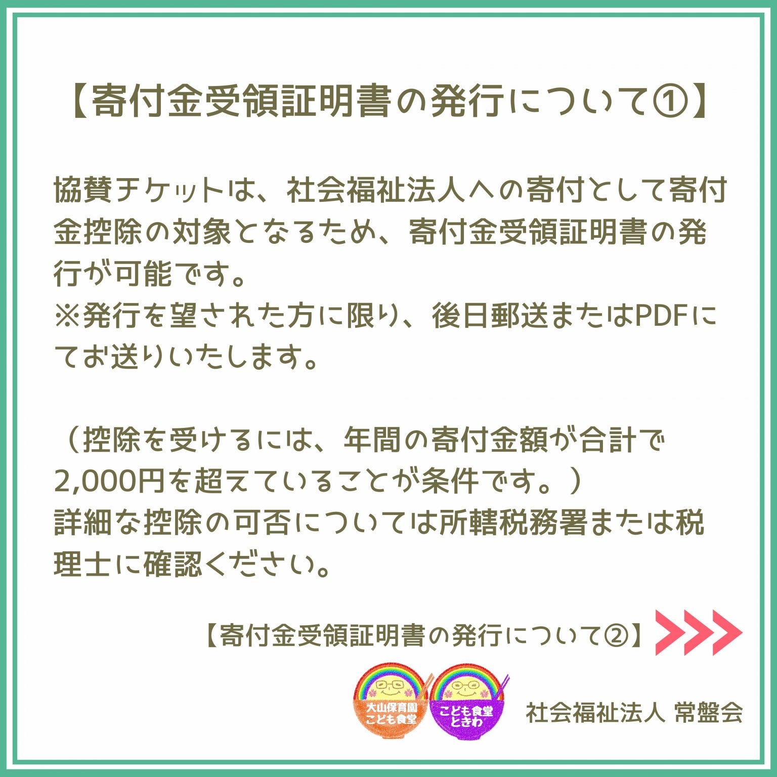 協賛チケットは、社会福祉法人への寄付として寄付金控除の対象となるため、寄付金受領証明書の発行が可能です。