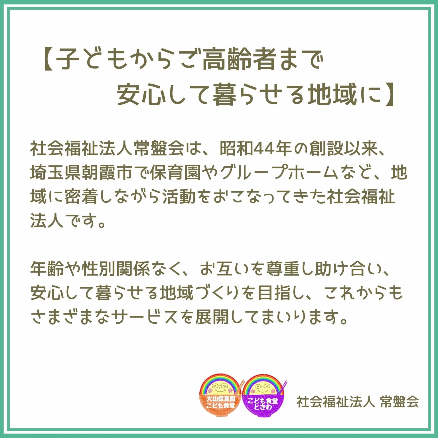 社会福祉法人常盤会では、これからも地域のみなさまのお役にたち、子どもたちに笑顔を届けられるよう、様々なことを活動してまいります。