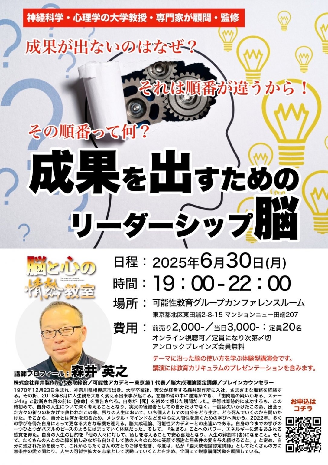 本講座では、脳科学・心理学をベースに、成果を出すリーダーが無意識に行っている脳の使い方と行動の順序を、体験的に学びます。
