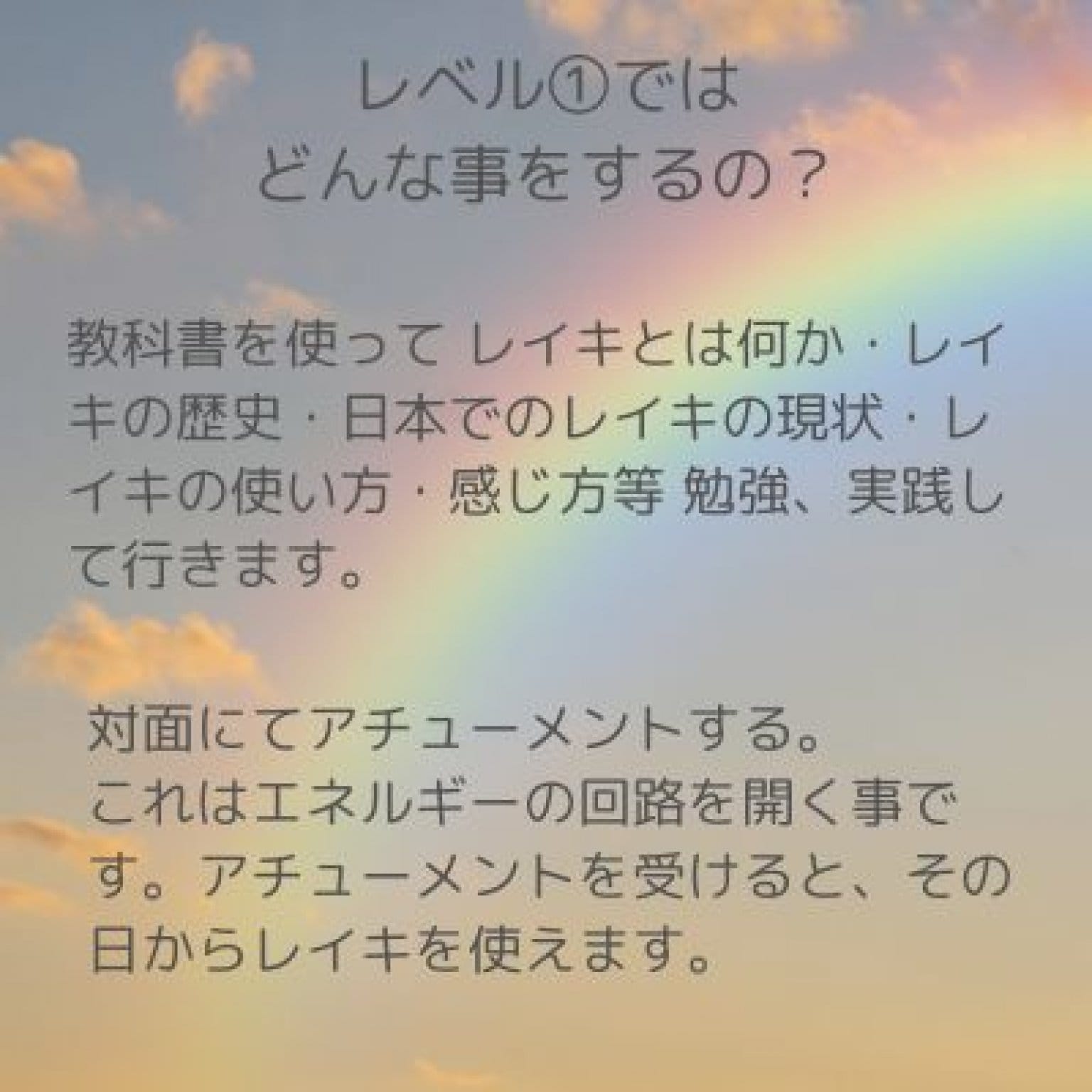 レイキとは何か、レイキの歴史、使い方等の座学、そしてアチューメント(エネルギーの回路を開く)、実践。一日約5時間ほどでレベル①の講習は終了します。その日からレイキを使えるようになります。