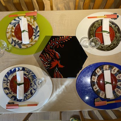 デザインコンセプト:天下泰平を象徴する鳳凰。この東道盆を家族で囲み、時代を超えて子孫も平穏な日々を過ごせるよう願いを込めた。元は古典柄ではあるが、ダイナミックに絵柄を取り入れる事で現代風にアレンジ。