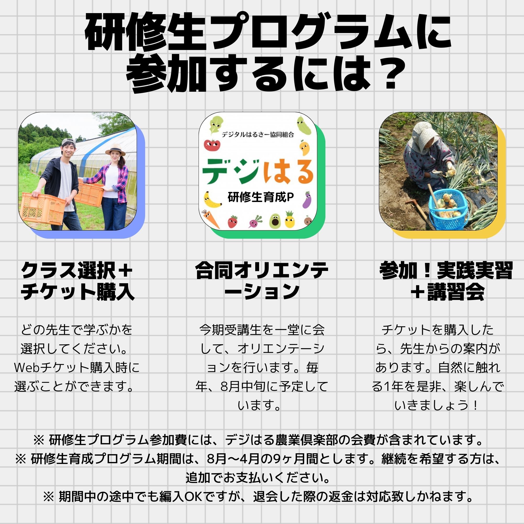 ※ 研修生プログラム参加費には、デジはる農業倶楽部の会費が含まれています。