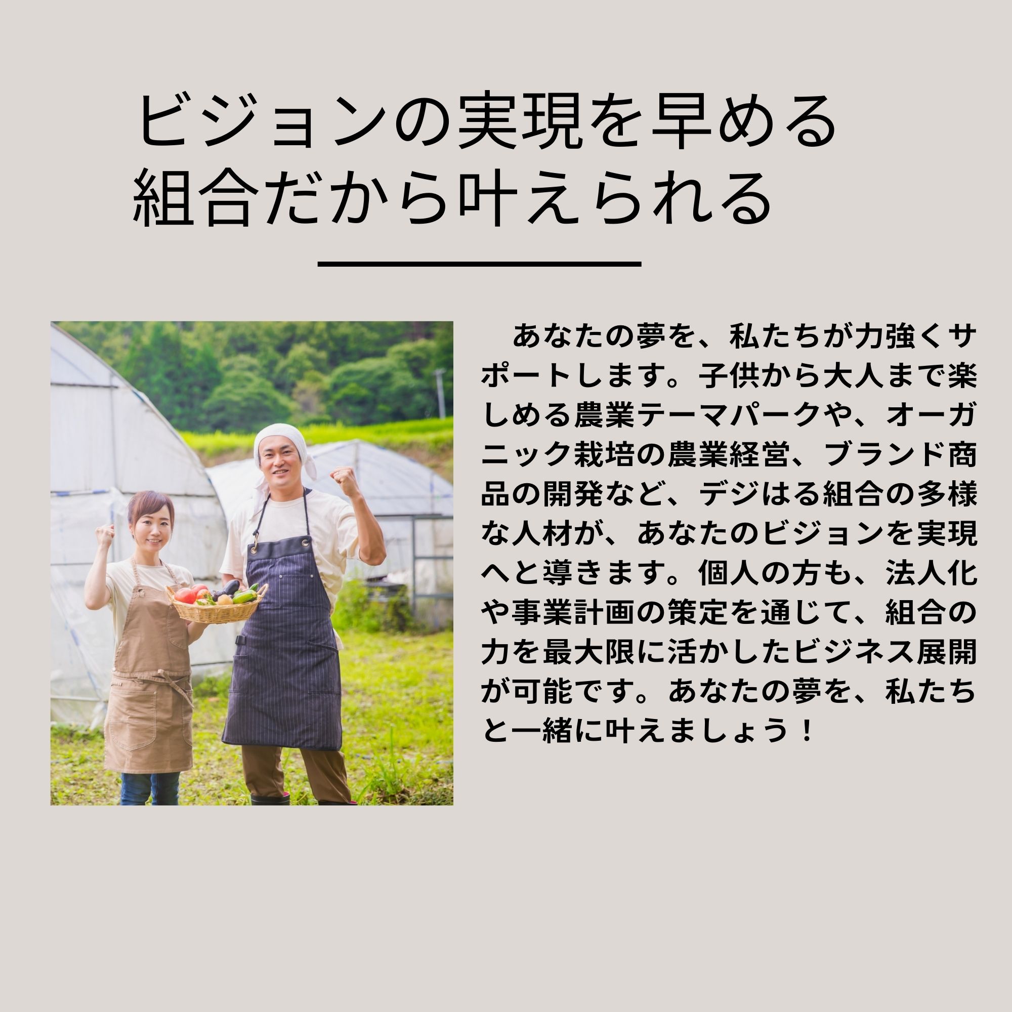 あなたの夢を、私たちが力強くサポートします。子供から大人まで楽しめる農業テーマパークや、オーガニック栽培の農業経営、ブランド商品の開発など、デジはる組合の多様な人材が、あなたのビジョンを実現へと導きます。個人の方も、法人化や事業計画の策定を通じて、組合の力を最大限に活かしたビジネス展開が可能です。あなたの夢を、私たちと一緒に叶えましょう!