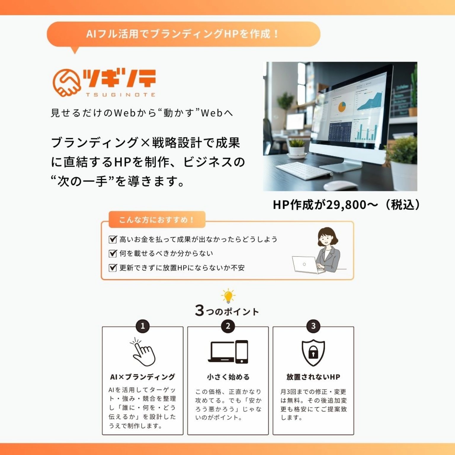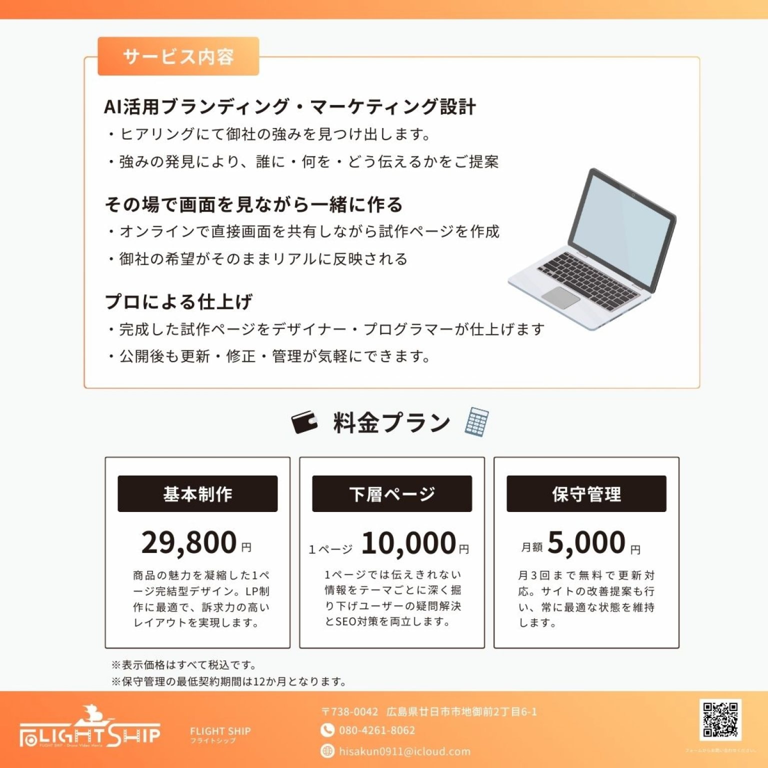 従来の制作会社では数十万円かかるクオリティを、29,800円〜で実現。さらに保守管理費も月額5,500円と、継続的な負担も最小限に抑えられます。