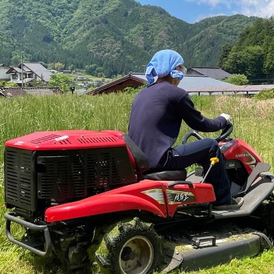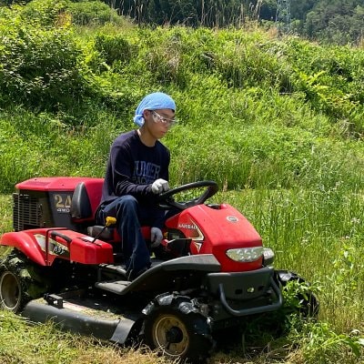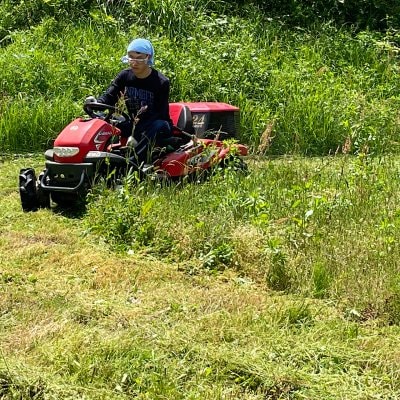 4輪の乗用草刈り機に乗り畑の牧草を刈っていただきます。何人様でも交代で乗っていただけます。