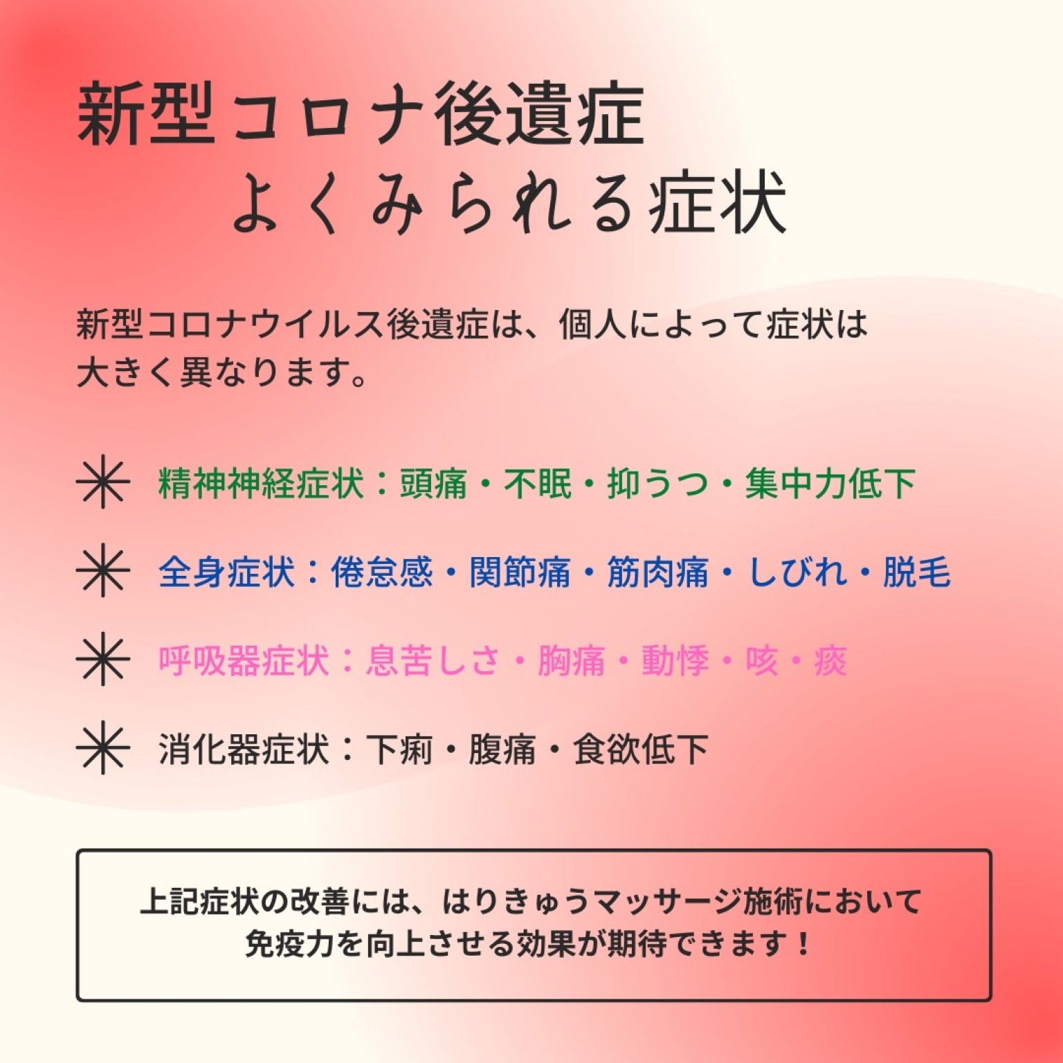コロナ感染症後の後遺症の主な症状は全身の倦怠感や筋肉・関節の痛みなど、日ごろから鍼灸治療において治療対象になる症状と類似しております。
