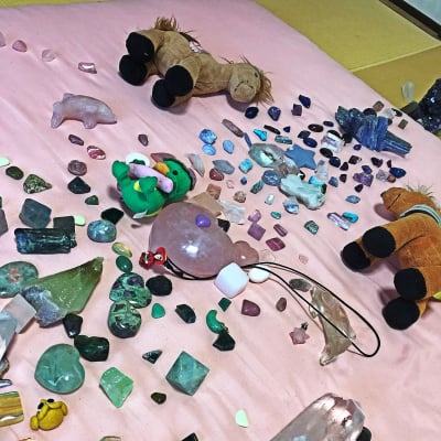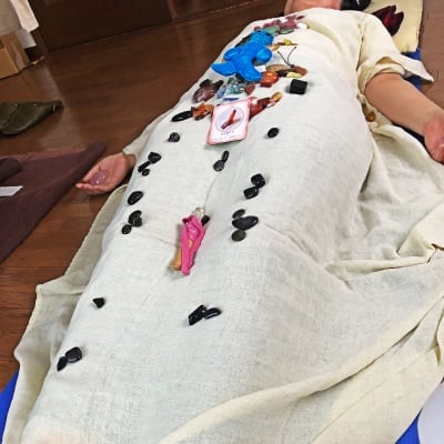 着衣のまま仰向けに横になってクリスタル(天然石)をたくさん体に乗せていくヒーリングです。