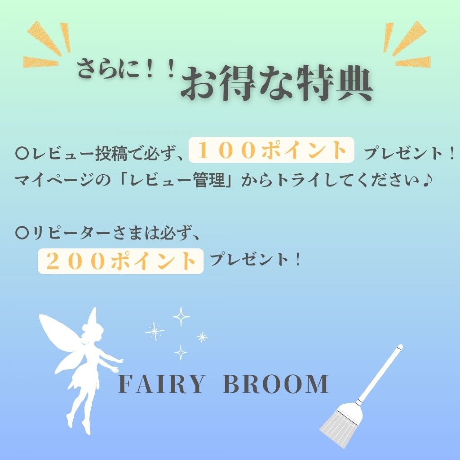FAIRY BROOMの『メルマガ登録』をしていただけたら、初めてのご購入で500ポイント又はウェルカムドリンク1杯サービスいたします。