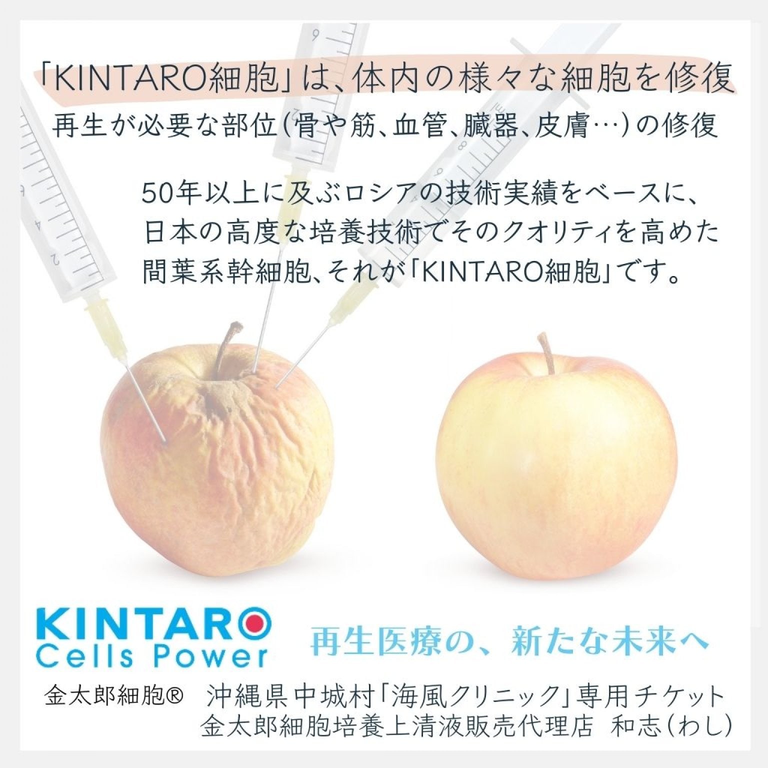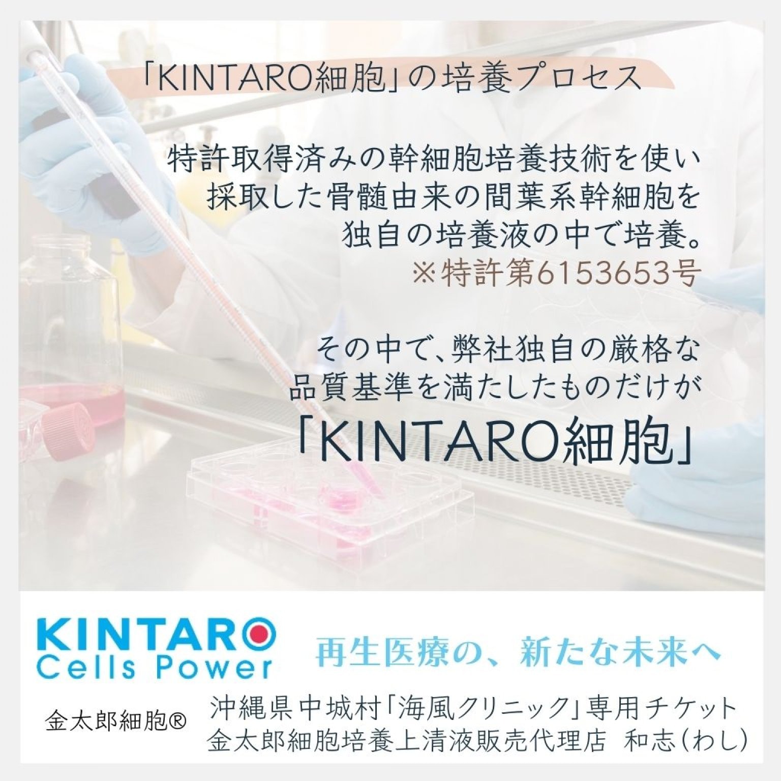 弊社扱っているのは『株式会社 金太郎 Cells Power』が製造開発している「KINTARO細胞」です。「KINTARO細胞」は、疾病の治療や予防、医療アンチエイジング、手術後のリカバリーなどを目的とした幹細胞です。