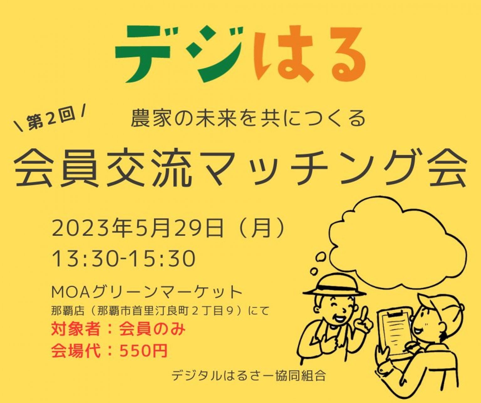 こんにちは!MOAグリーンマーケット那覇店会議室にて、会員様限定の交流マッチング会を行います!生産者の方や事業者の方など、農業のデジタル化に興味ある方はどうぞお越しください✨