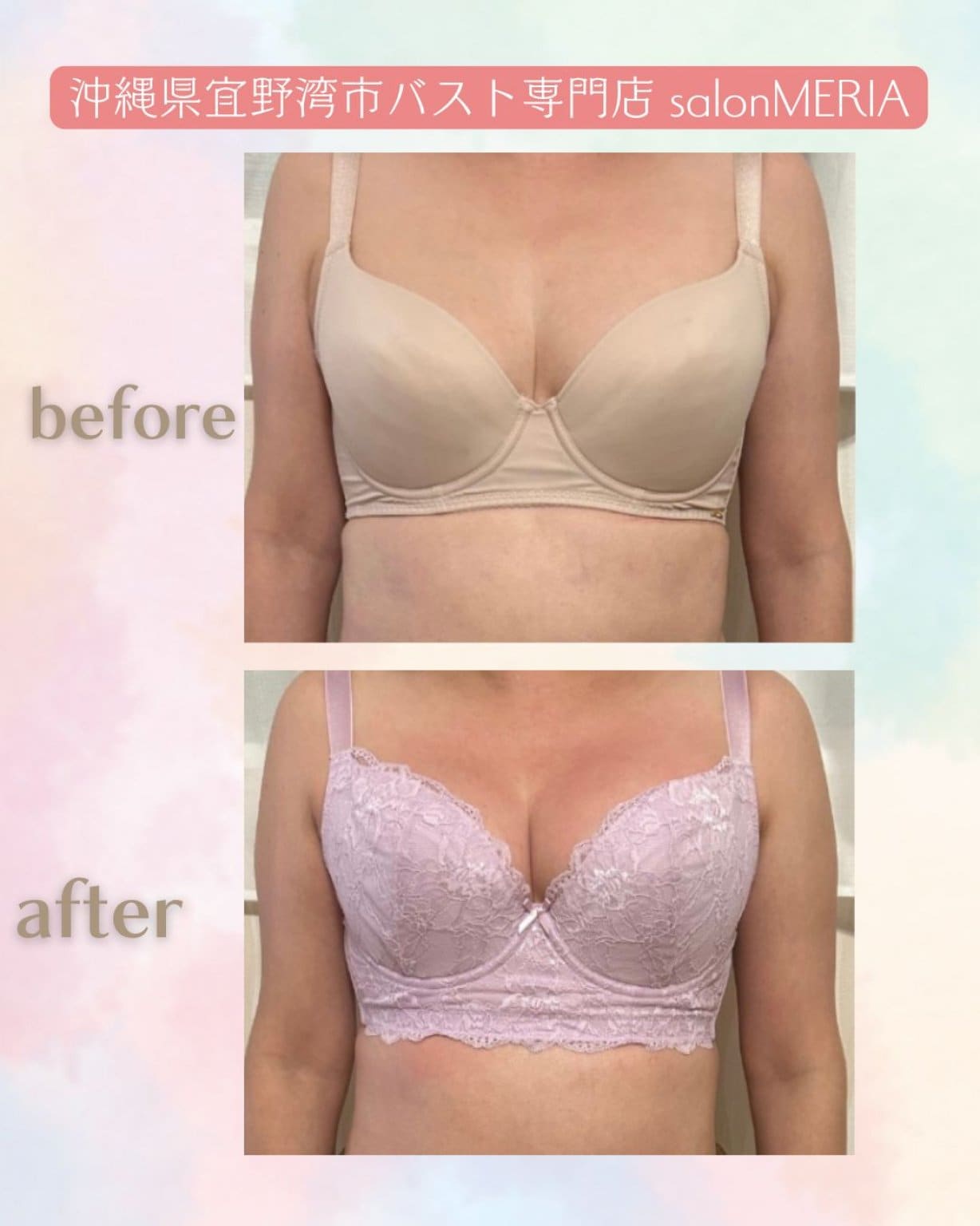 沖縄県宜野湾市にあるsalonMERIA(サロンメリア)では、現役作業療法士がバストに特化した総合的ケアを提供しております。女性の象徴である「バスト」と向き合うことで自分に自信を持ち笑顔になってほしいという思いで、バストの土台作り、食事療法、下着の着用方法などのアプローチを実践し、理想のバストへ育てていきます。