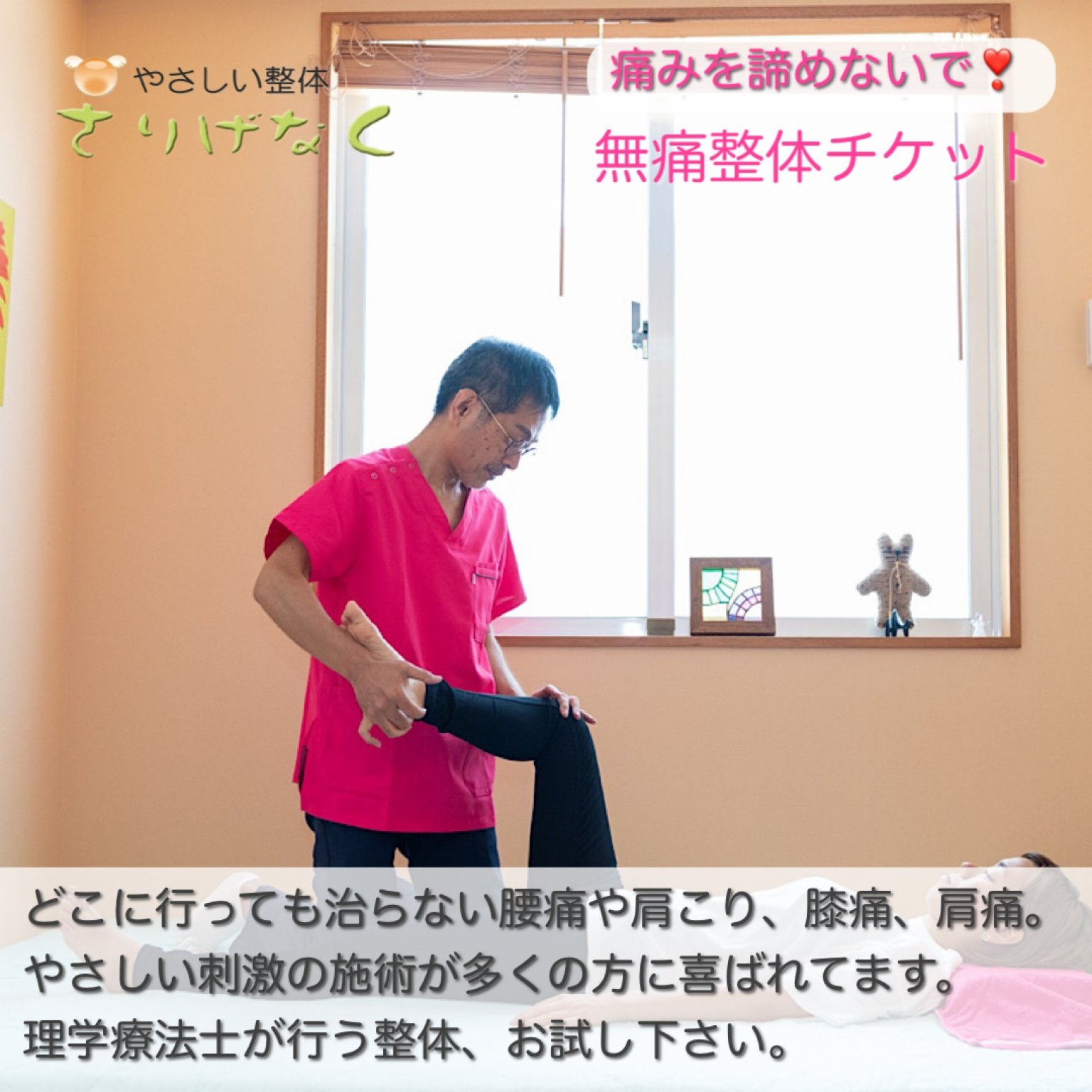 痛みの原因が病院のデータででなくても、実際の痛みを感じてるあなたから、痛みを取り除く方法はあります。そんな貴方に、やさしい整体さりげなくに、来ていただき、痛みが和いで身体が軽くなり笑顔が素敵な自分に出会いに来てほしいです。