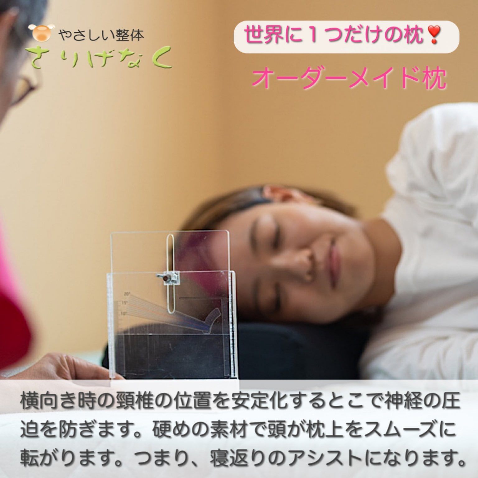 枕をオーダーメイド致します。来院して頂き、様々な角度から貴方様に合った最適な高さを決めます。計測後オーダーし、7日程で完成します。