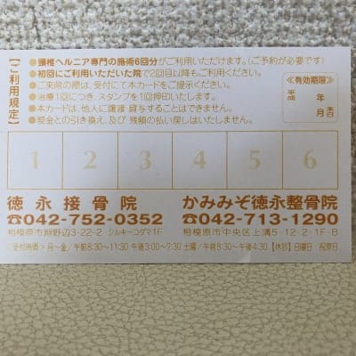 店頭払い専用頚椎ヘルニア専門整体回数券です。5回分の料金で6回の回数券なので、1回分お得です。さらにこちらを通して購入いただくと、ポイントまでつくので更にお得です。
