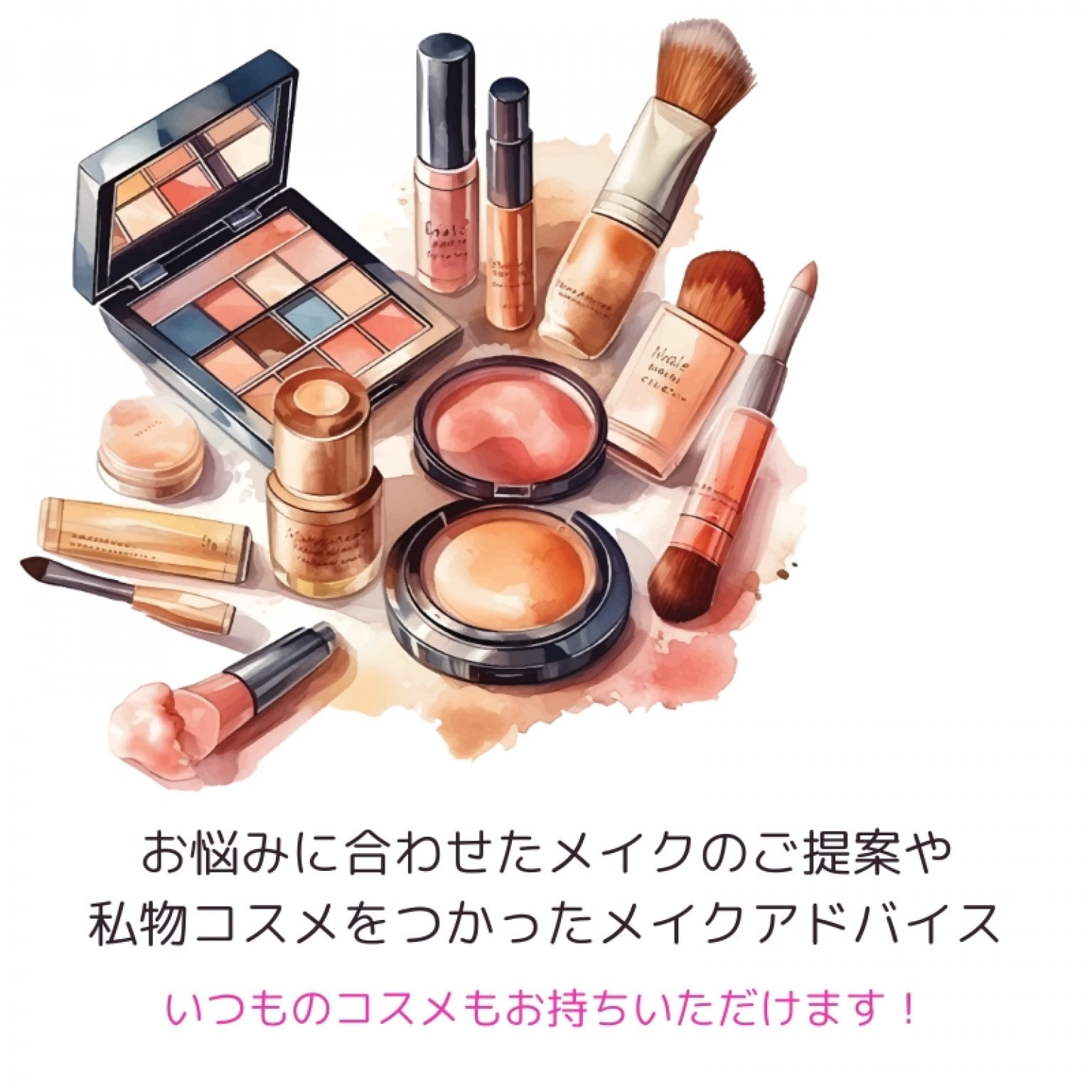①現在使用しております、クレンジング、スキンケア、ベースメイク、ポイントメイクをお持ち下さい。(お持ち頂ける範囲で構いません)