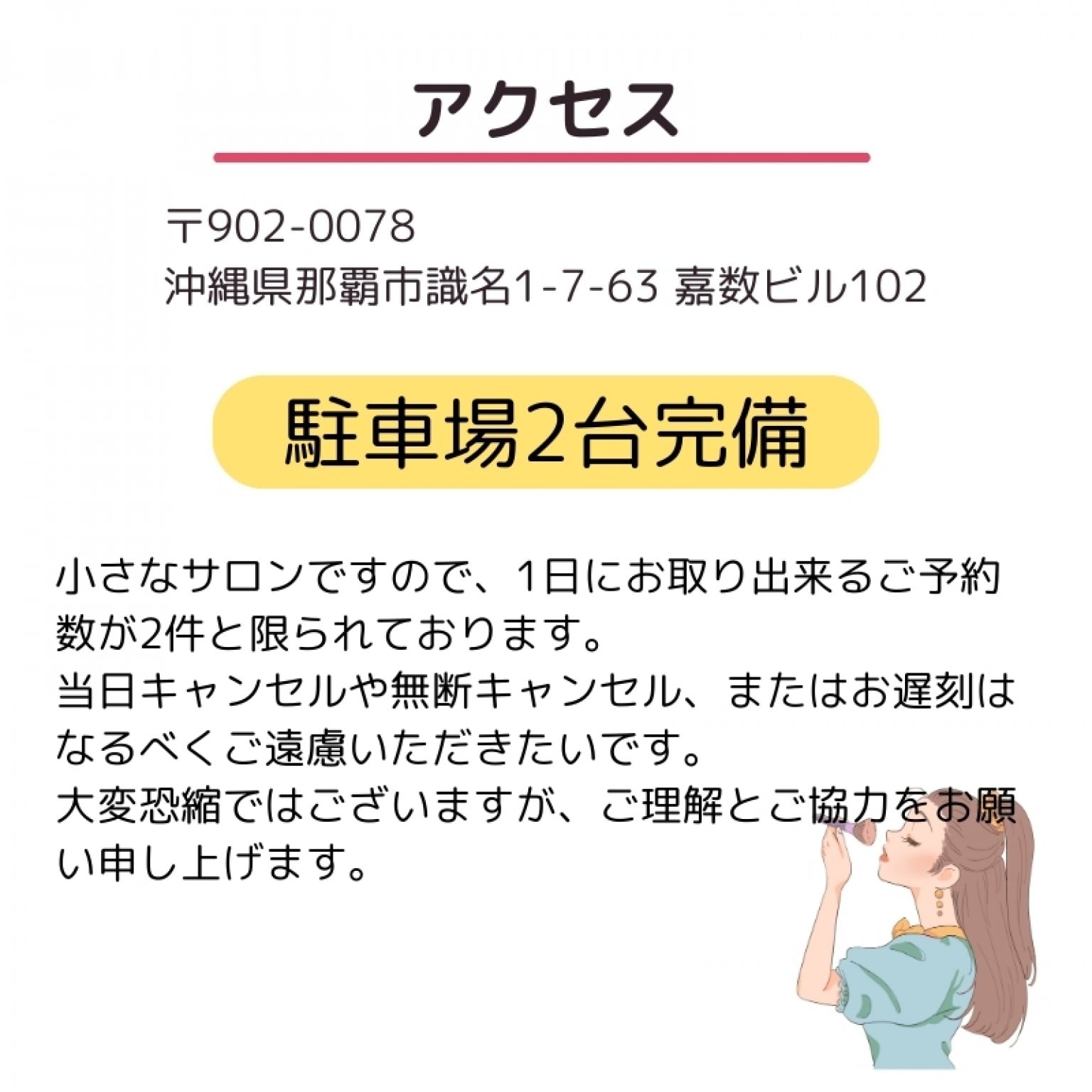 当サロンでは、当日キャンセルや無断キャンセルはなるべくご遠慮いただいております。