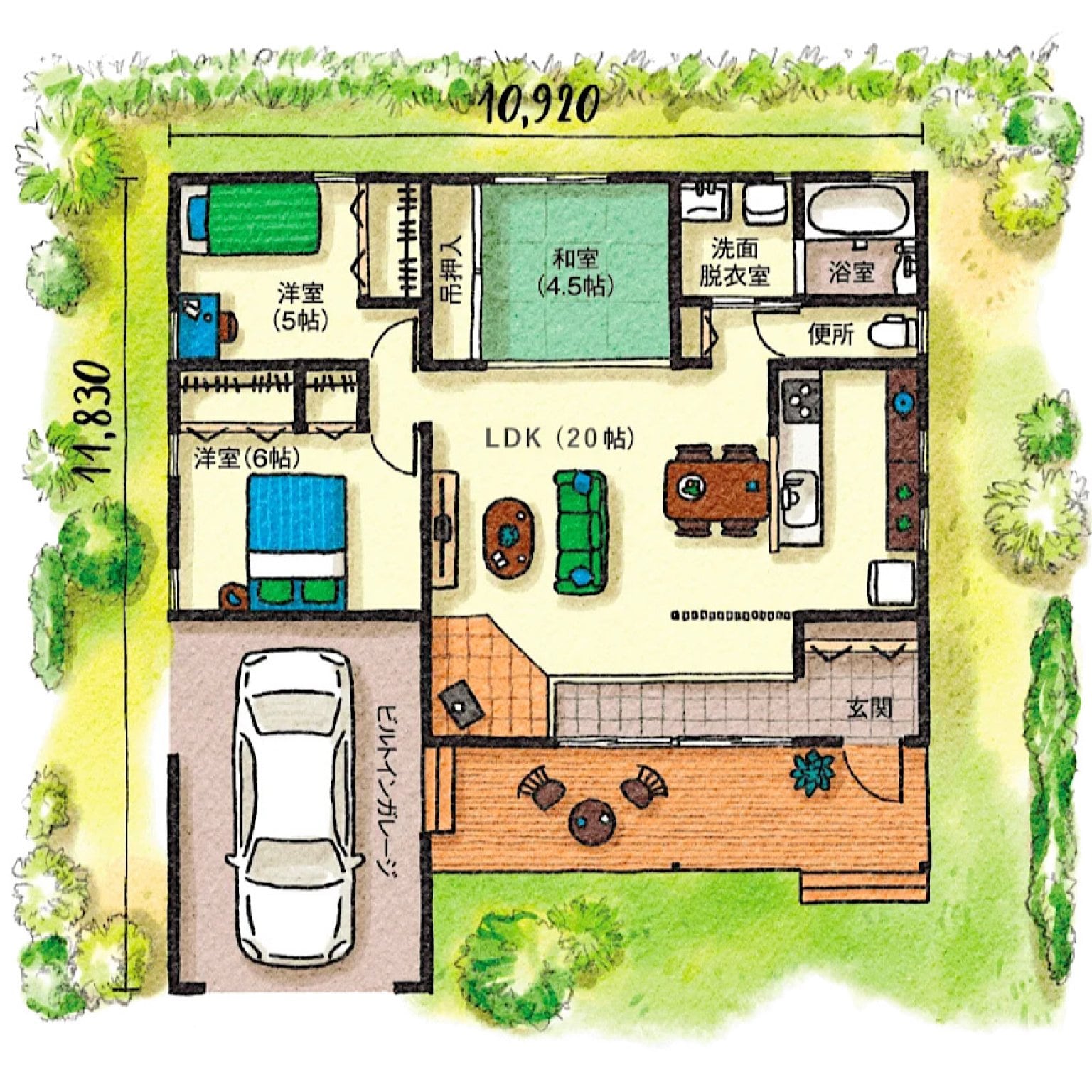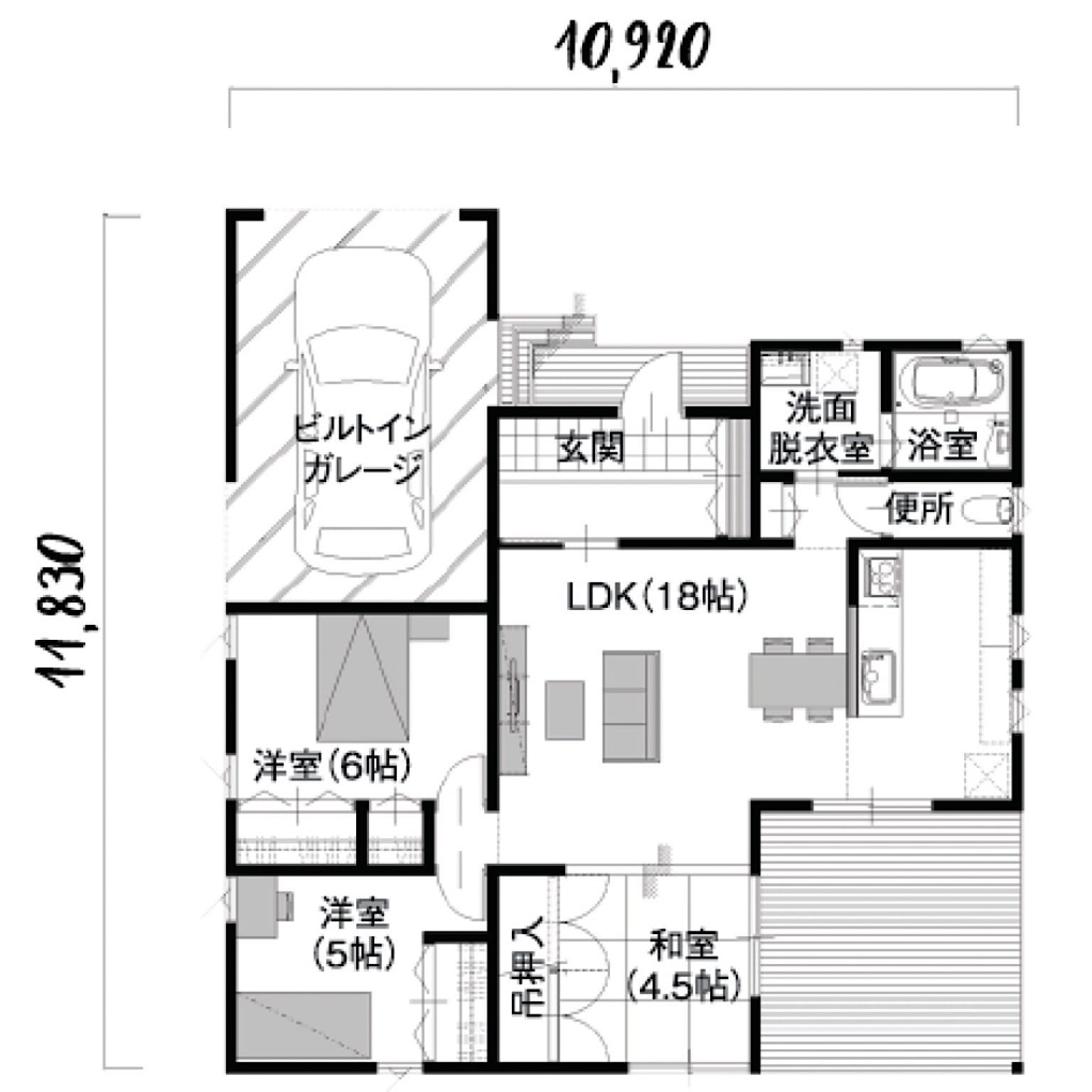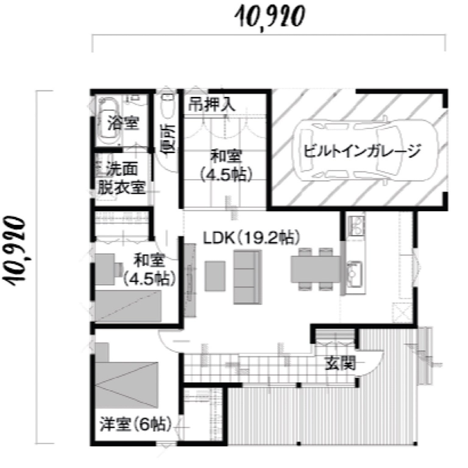多くの男性の憧れであり、遊び心をくすぐる「ビルトインガレージタイプ」では居住スペースはそのままに、雨の日も濡れずに乗り降りが可能で、愛車やスポーツギア、道具などを安心して保管できるスペースを生み出し、ご家族の多様な趣味にも対応できます。緻密な構造計算に基づき最高レベルの耐震性能を実現、ゼロエネルギーハウスの断熱基準をクリアした、省エネ性能の高い長期優良住宅です。縁側のようなフロントポーチによって、深い軒下空間が屋外、庭と連続した広がりを生み出し、平屋ならではの気持ちよさを際立たせます。また、部屋の垣根も低く、コミュニケーションもとりやすく子育て世代のおおらかでエコな暮らしを叶えます。平屋のフラットな空間は安全でスムーズな導線を実現し、家事の負担や転倒などの家庭内事故も軽減します。