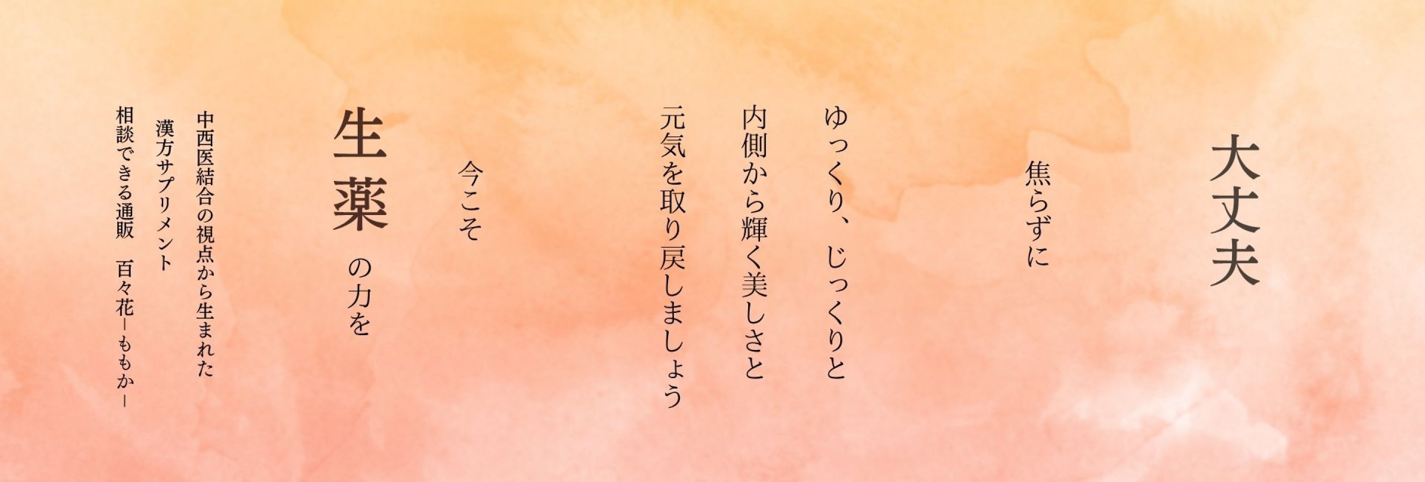百々花では、お客様一人ひとりのお悩みと体質に合わせた漢方サプリメントをご提案しています。西洋医学と中医学を結合した統合医療の考え方で皆さまをサポートしておりご相談を承ります。当店取り扱いの漢方サプリメントは医薬成分は含まれておりません。